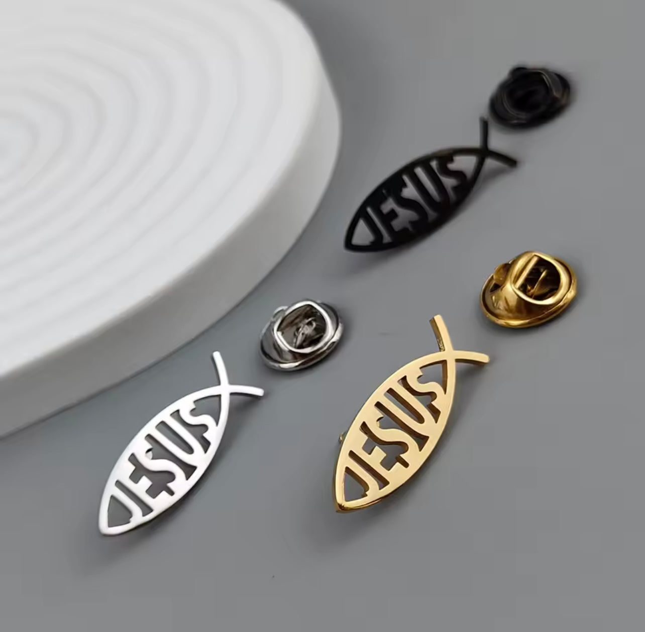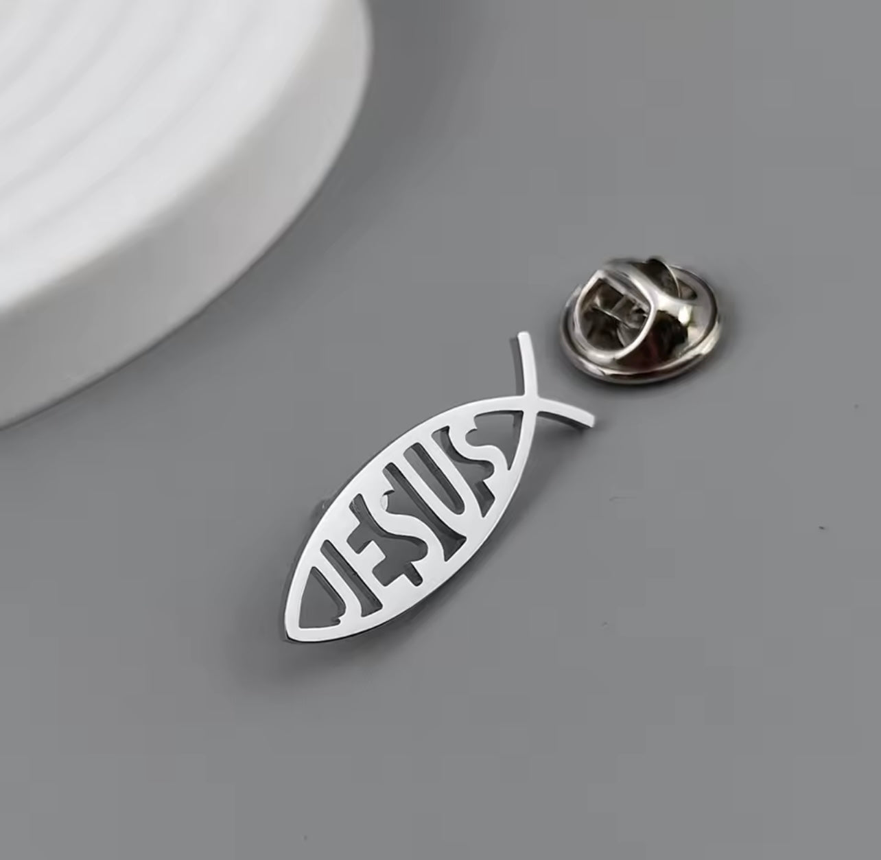 Die Brosche ist klein geschnitten und mit dem Namen Jesus verziert. Es besteht aus Metall und Edelstahl. Die Brosche ist ein echter Hingucker und schönes Accessoire..
