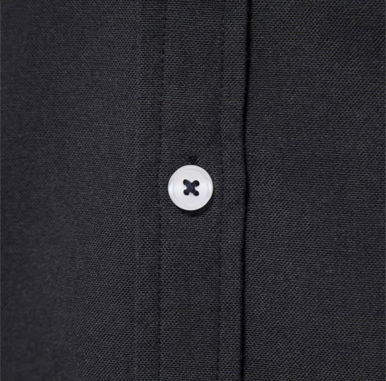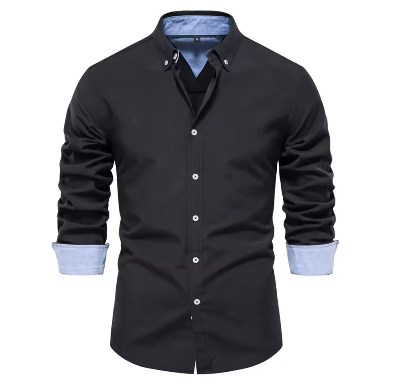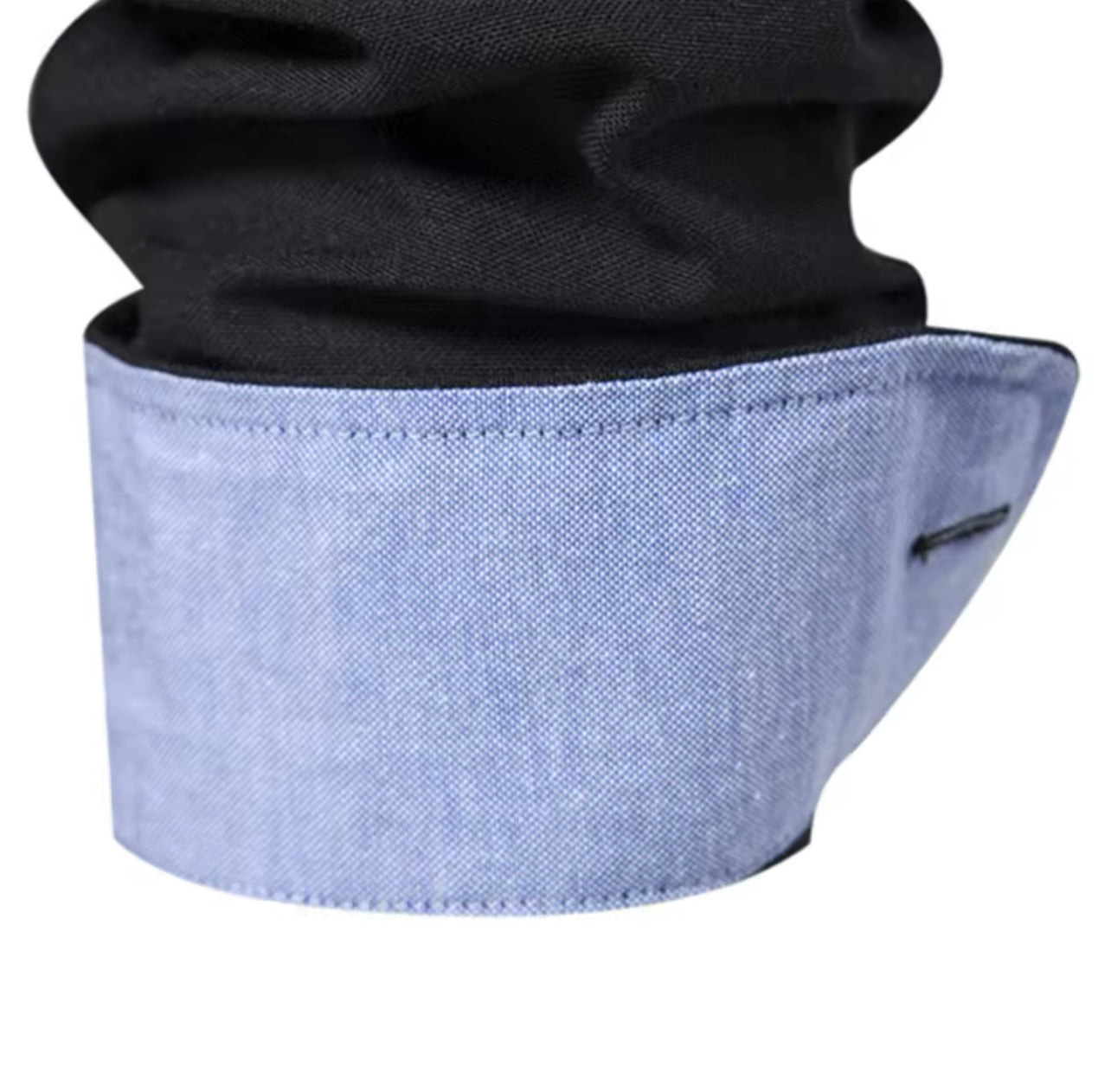 Das Hemd ist gerade geschnitten, zweifarbig und mit Knöpfen verziert. Es besteht aus Polyester, Baumwolle und feinem Wollstoff.