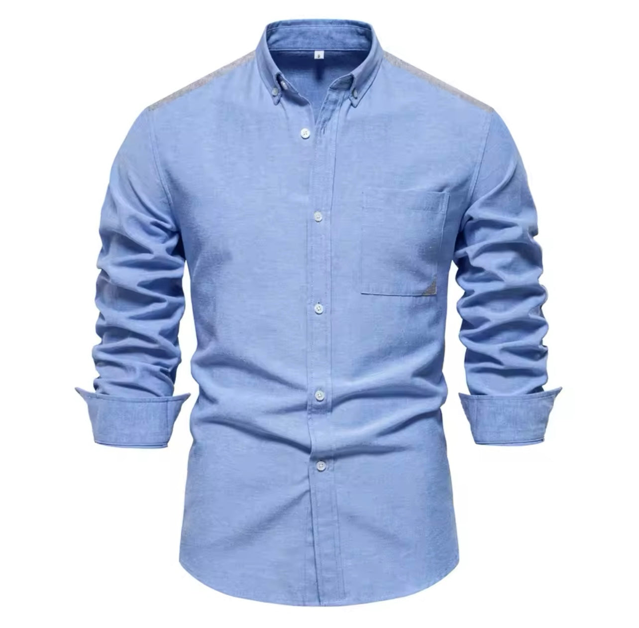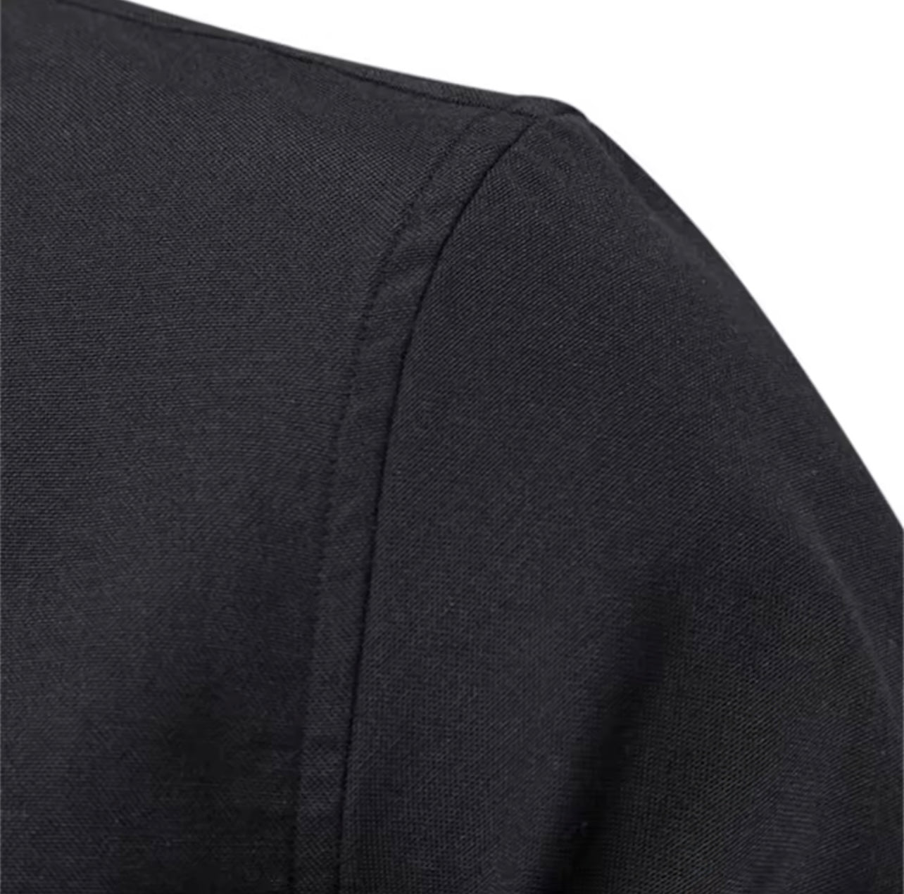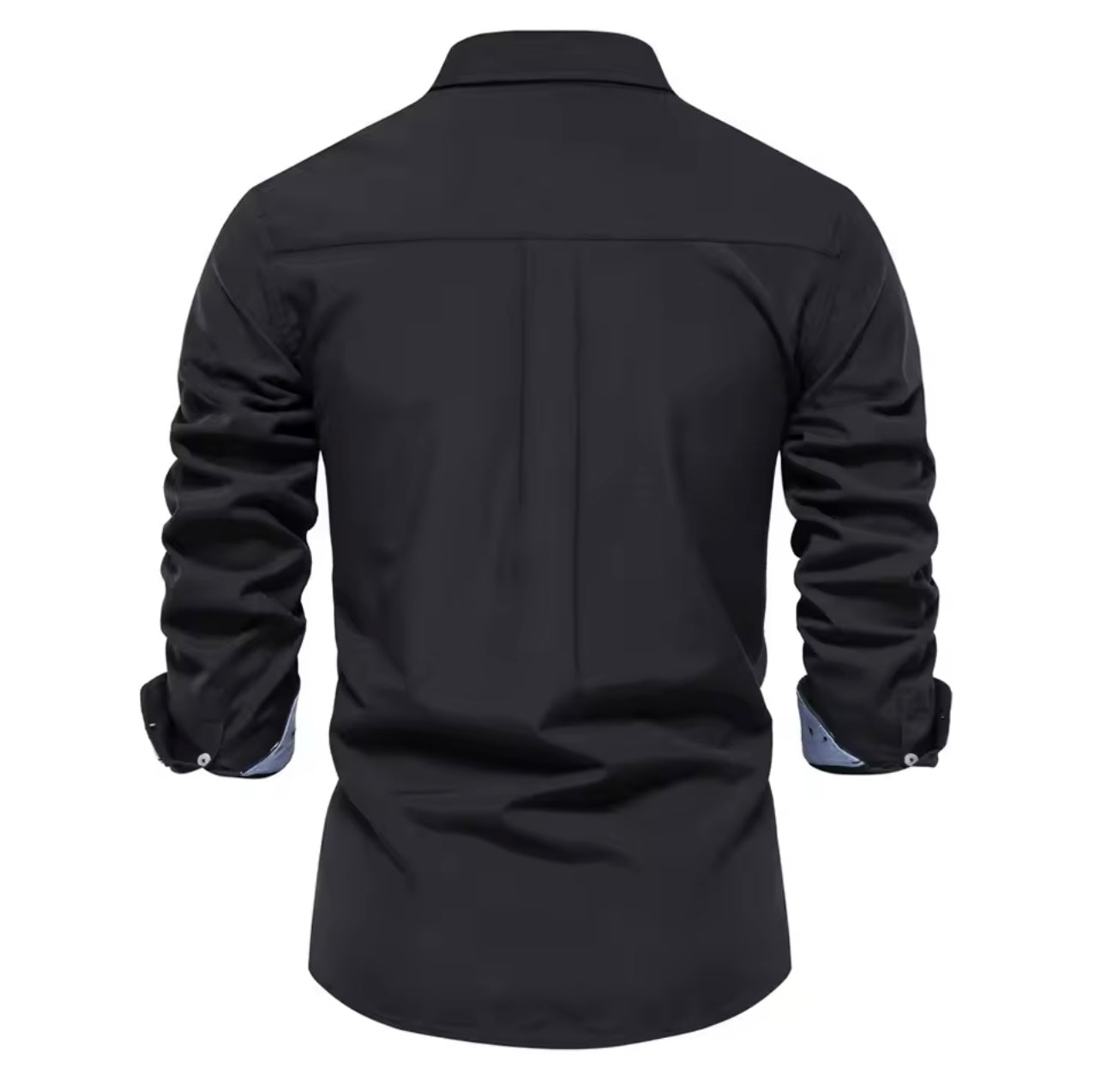 Das Hemd ist gerade geschnitten, zweifarbig und mit Knöpfen verziert. Es besteht aus Polyester, Baumwolle und feinem Wollstoff.