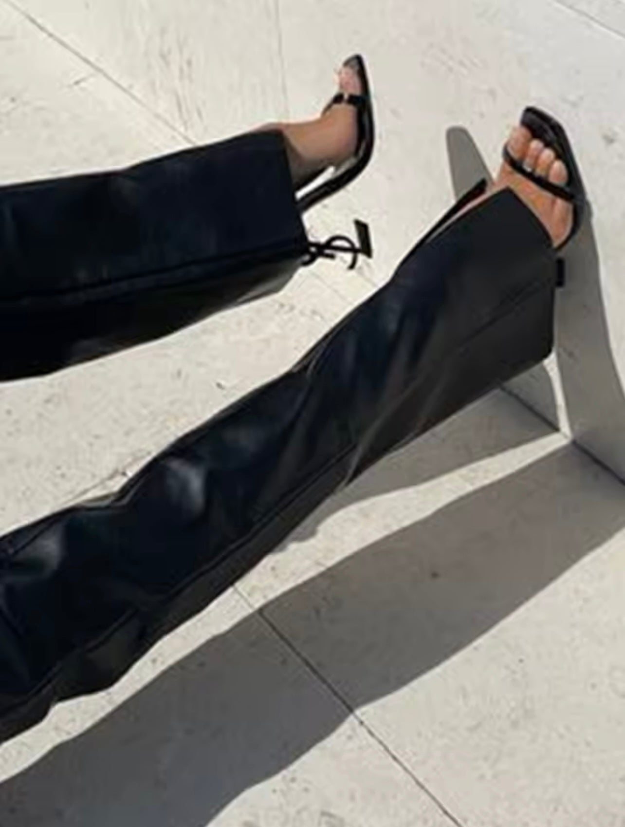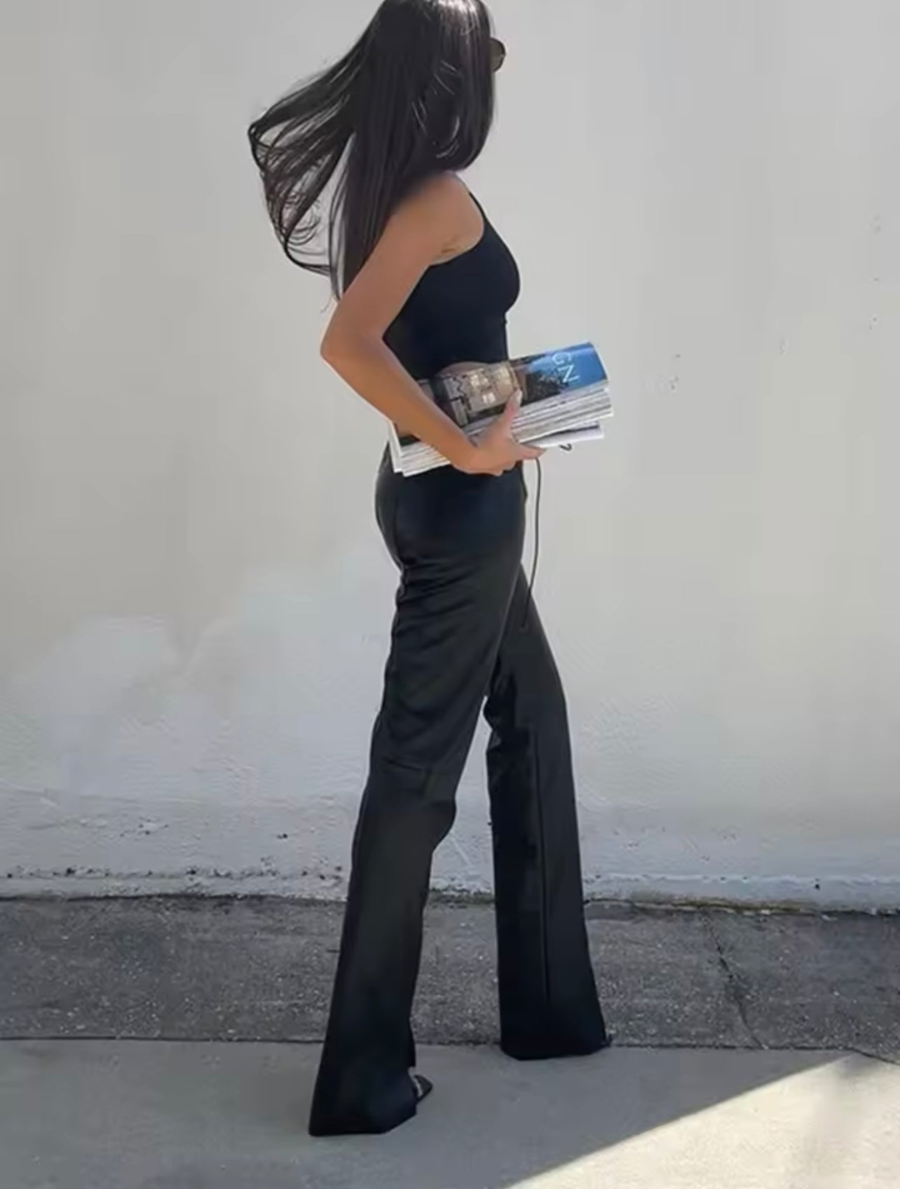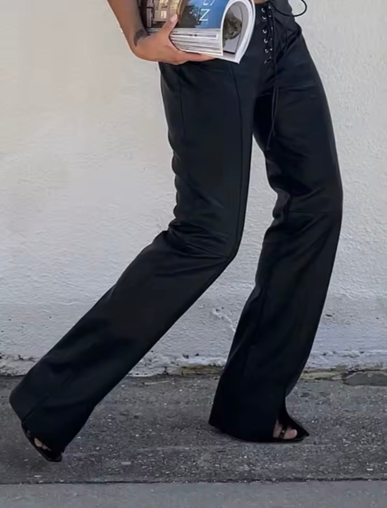 Die Hose ist lang, gerade geschnitten, oben zum Binden und unten mit einem Schlitz verziert. Sie besteht aus Kunstleder, Polyester, Elasthan und leichtem Stretch. Die Hose ist ein echter Hingucker..