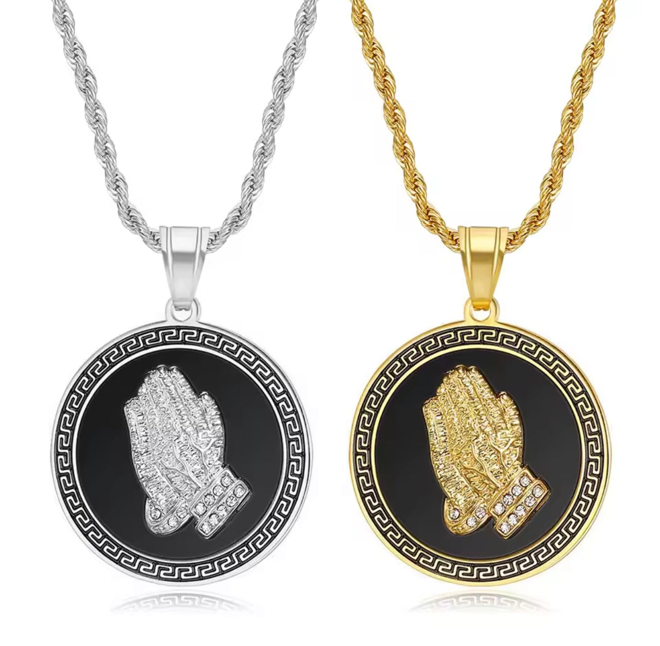 Die Kette ist rund geschnitten und mit Betenden Händen verziert. Sie besteht aus Edelstahl und Zirkon. Die Kette ist ein absoluter Hingucker und passen perfekt zu jedem Look..