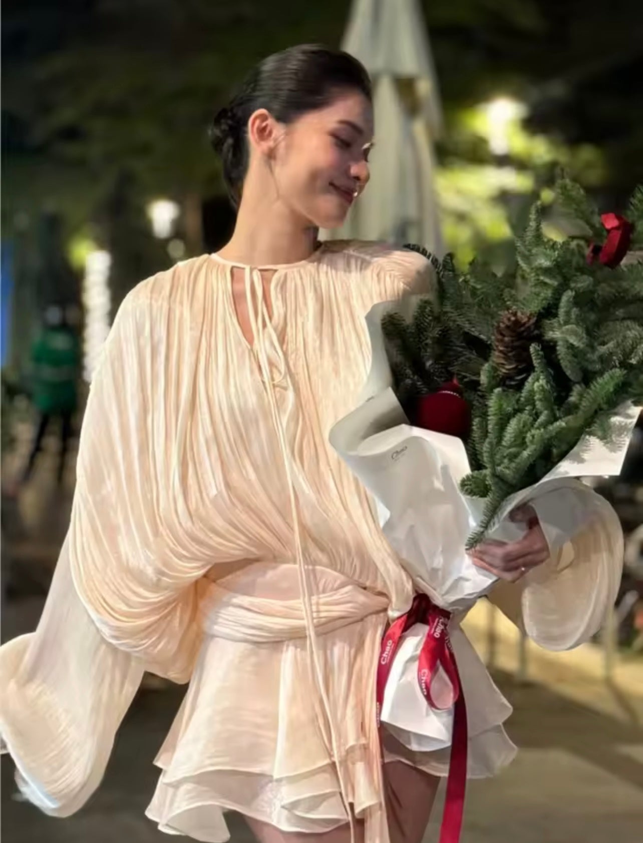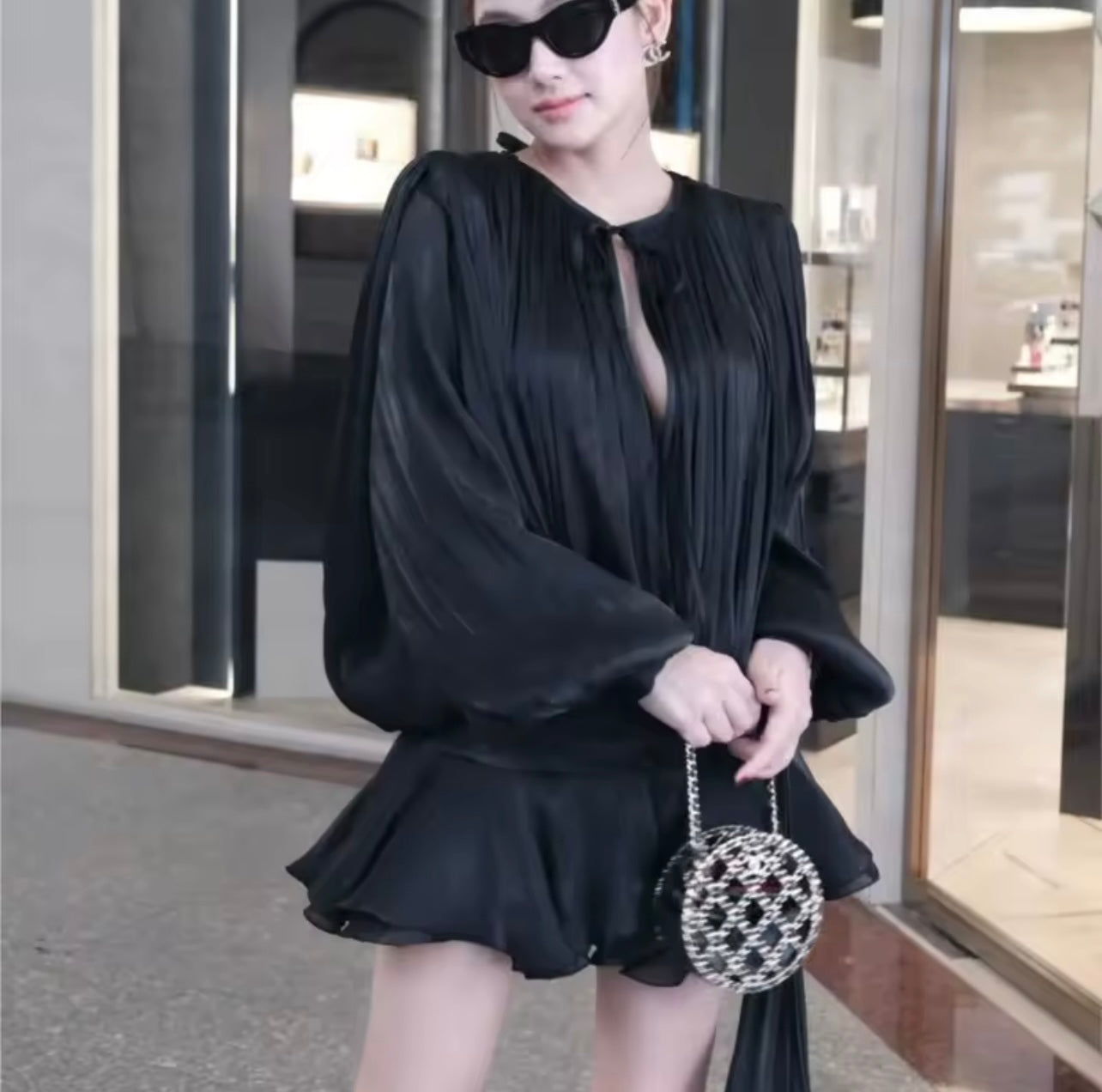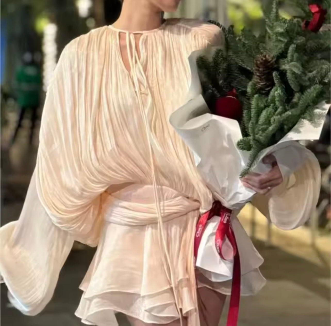 Das Kleid ist kurz, weit, langärmlig und zum binden geschnitten.. Es besteht aus Baumwolle, Leinen und leichtem Stretch..