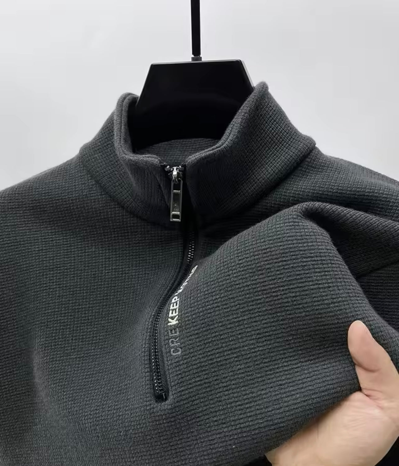 Der Pullover ist mit einem hohen Kragen geschnitten und mit einem Reißverschluss verziert. Er besteht aus Polyester und Wolle.