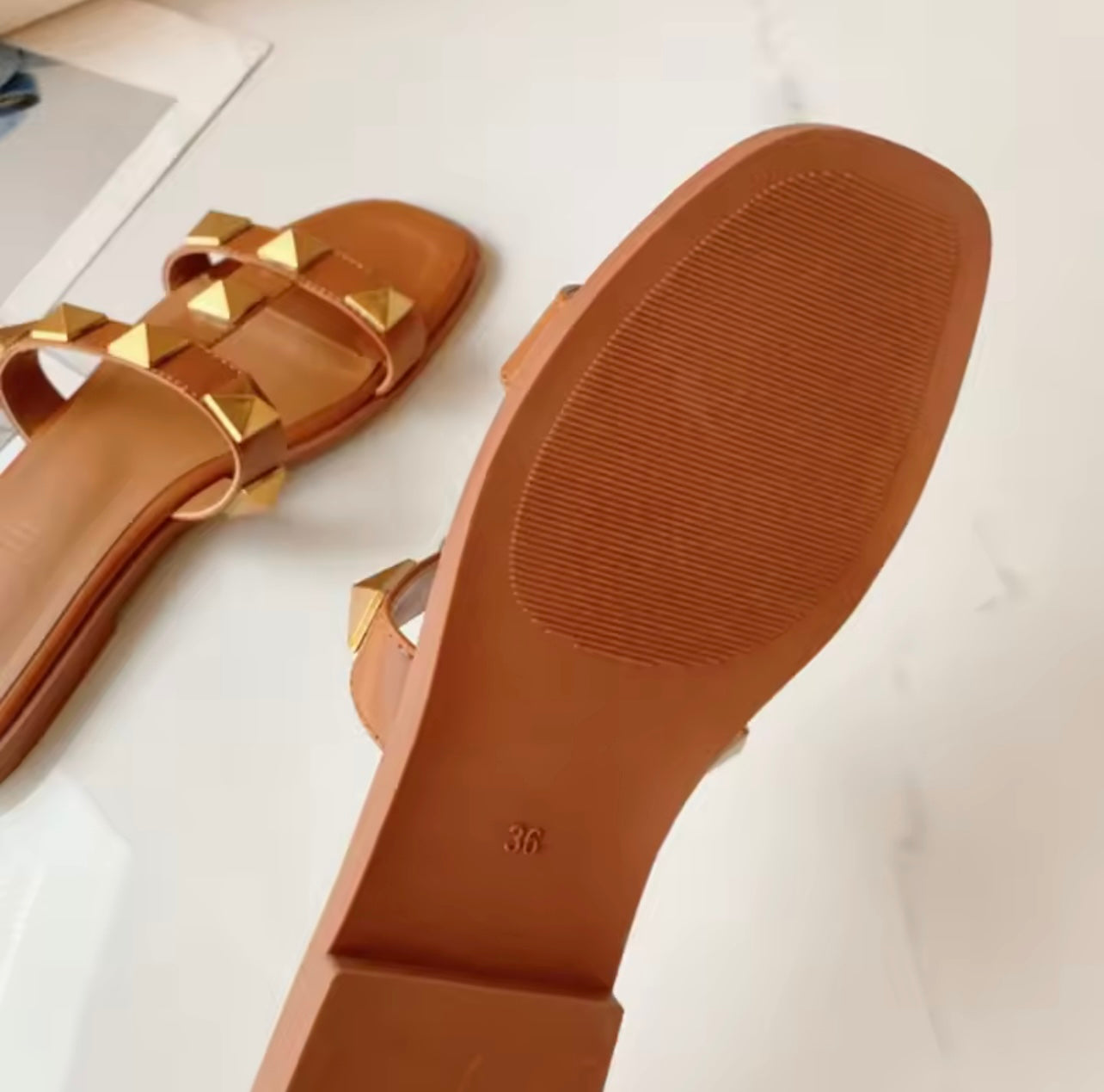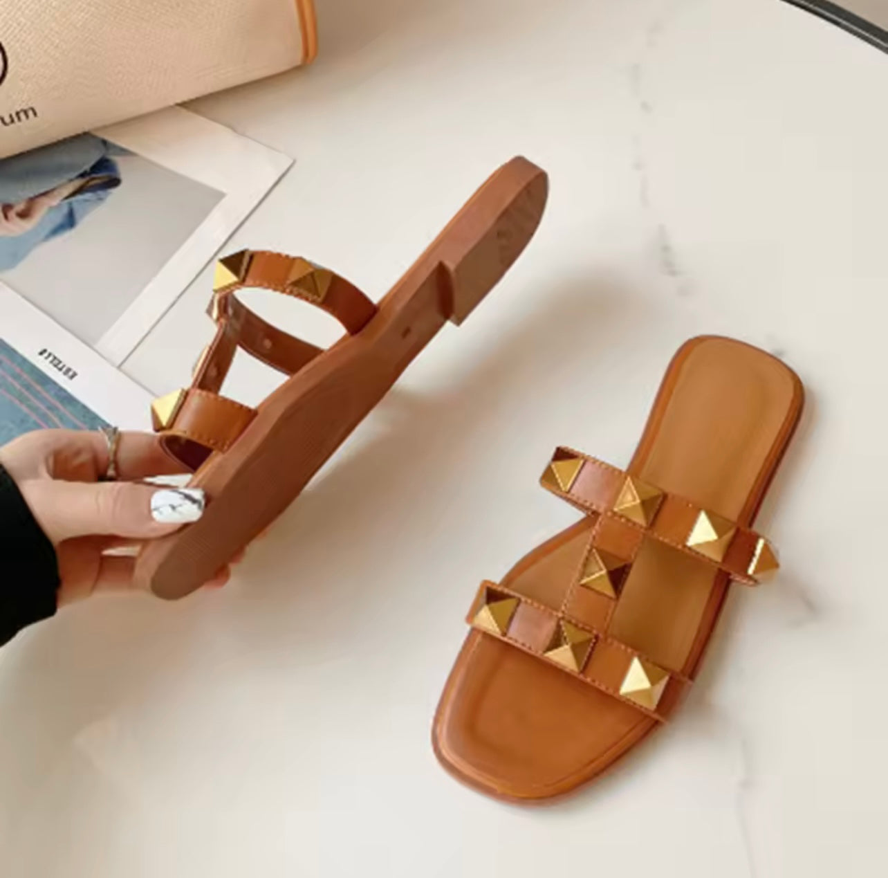 Die Sandalen sind offen geschnitten, mit Striemen und Nieten verziert. Sie bestehen aus Kunstleder. Die Sandalen sind das absolute Must Have für den Sommer..