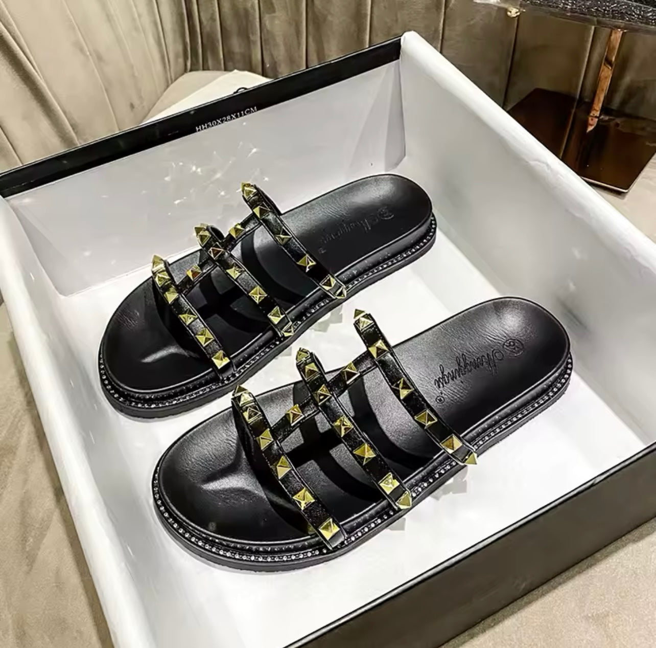 Die Sandalen sind offen geschnitten, mit Riemen und Nieten verziert. Sie bestehen aus Kunstleder und Nieten. Sie passen perfekt zu jedem Style..