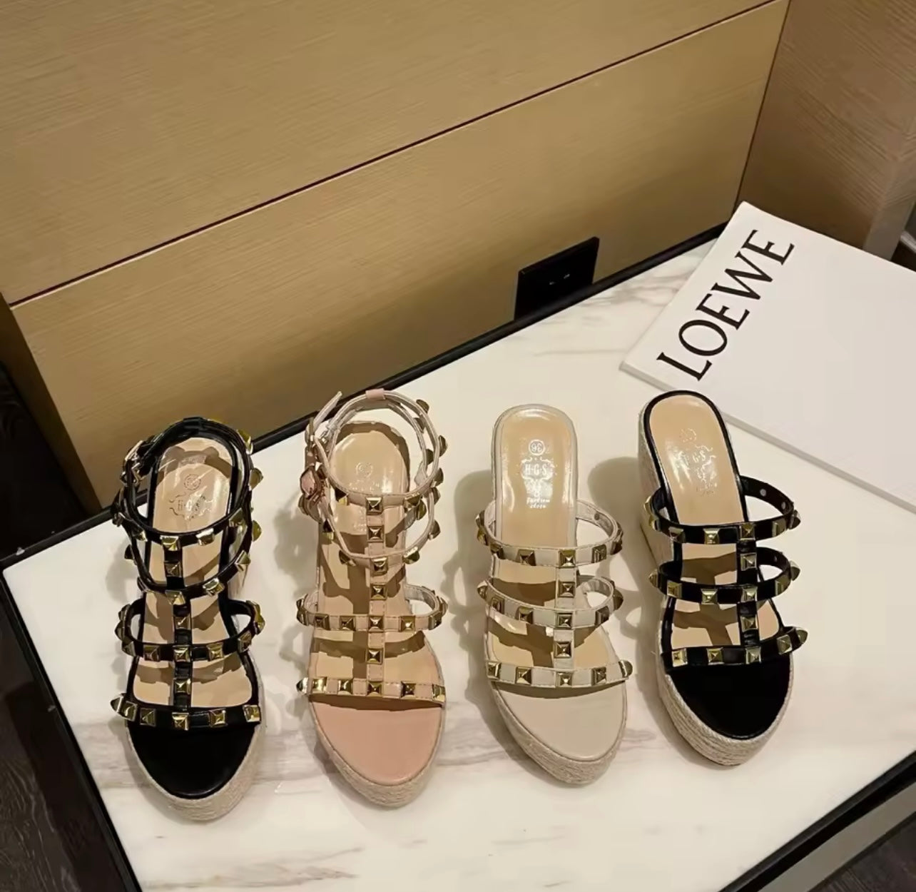 Die Sandalen mit 10cm Keilabsatz sind offen geschnitten, mit Riemchen und Nieten verziert. Sie bestehen aus Stroh, Polyester und Kunstleder. Die Sandalen passen perfekt zu jedem Sommer Look…
