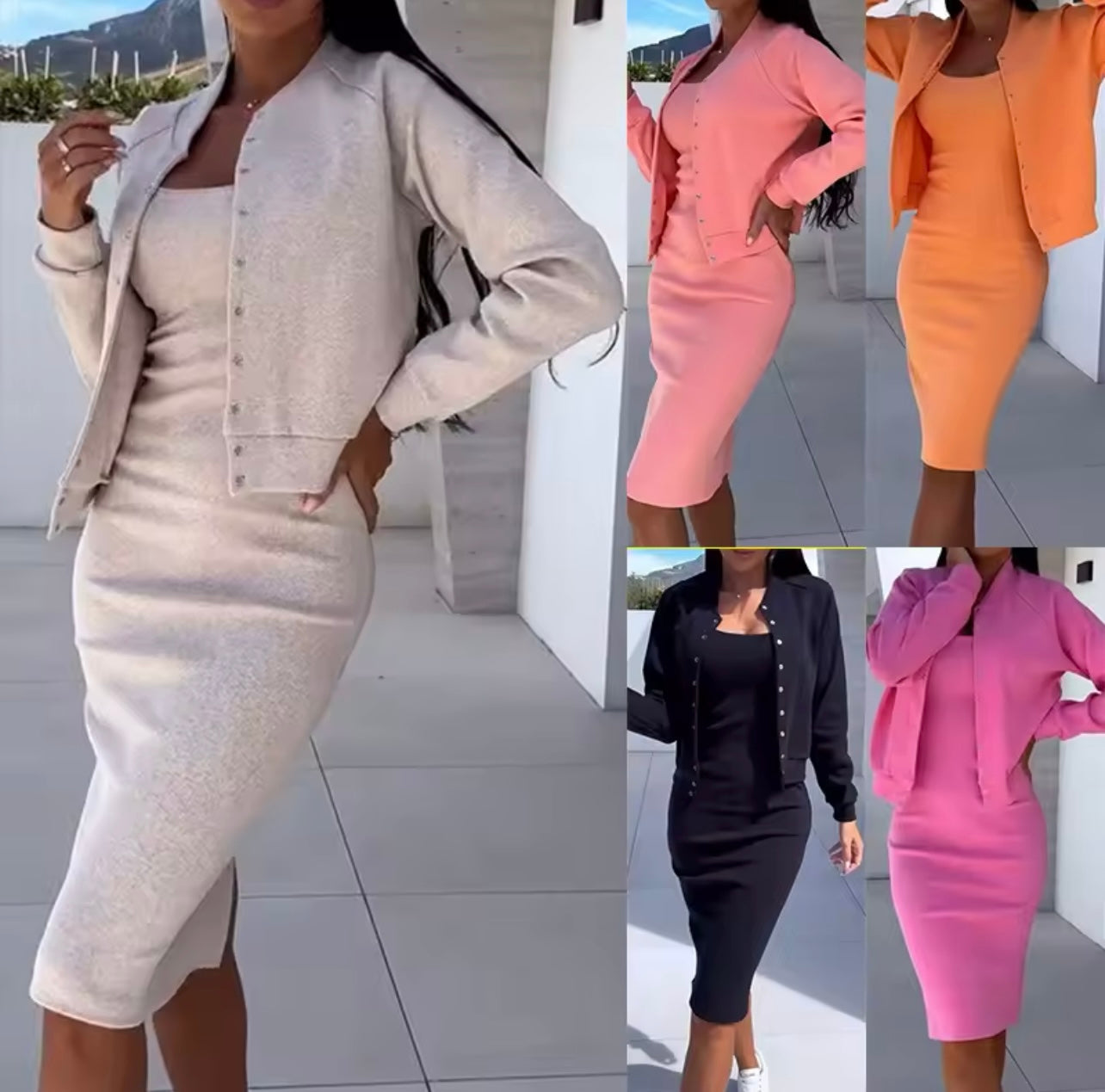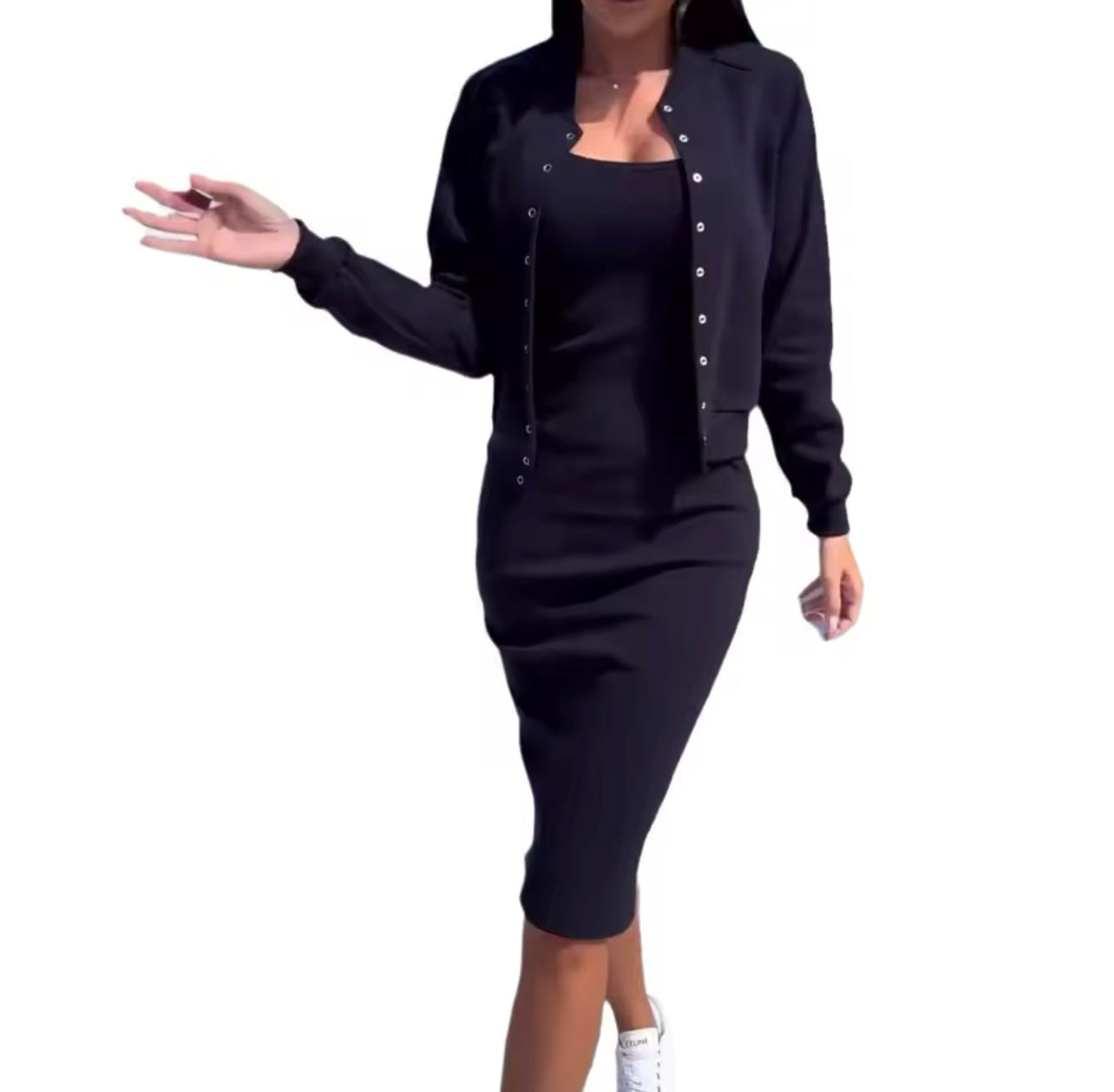 Das Set enthält ein Kleid das Knielang geschnitten ist, ein Jäckchen das gerade geschnitten und mit Druckknöpfen verziert ist. Es besteht aus Kunstfaser und Polyester. Das Set passt perfekt zu jedem Look..