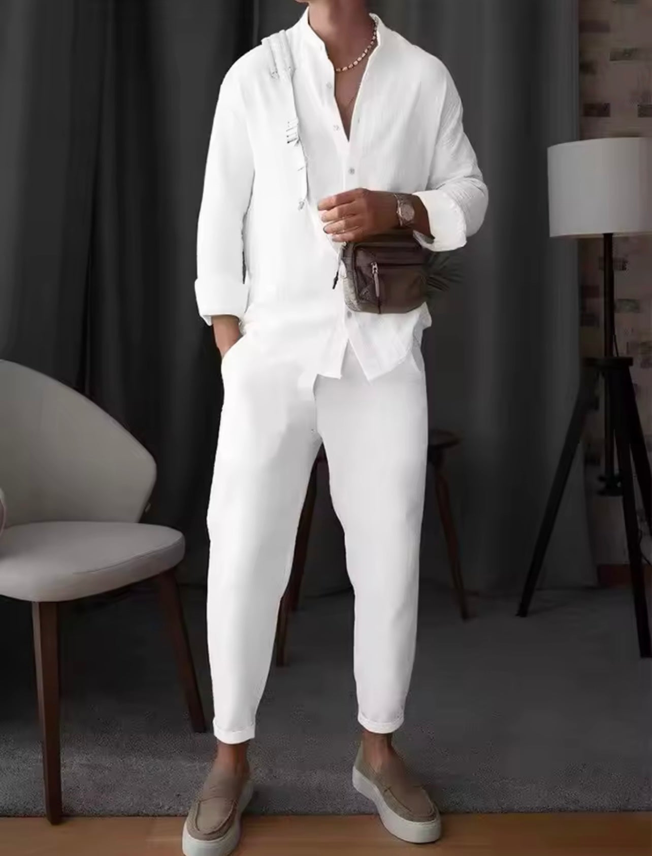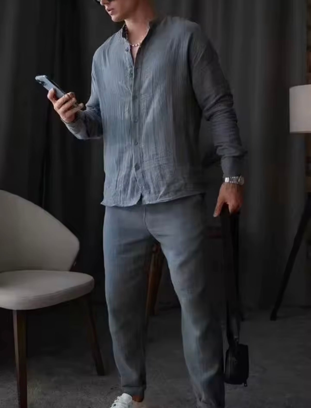 Das Set ist langärmlig geschnitten und mit Knöpfen verziert.. Es besteht aus Baumwolle und Leinen. Es passt perfekt zu jedem Look..