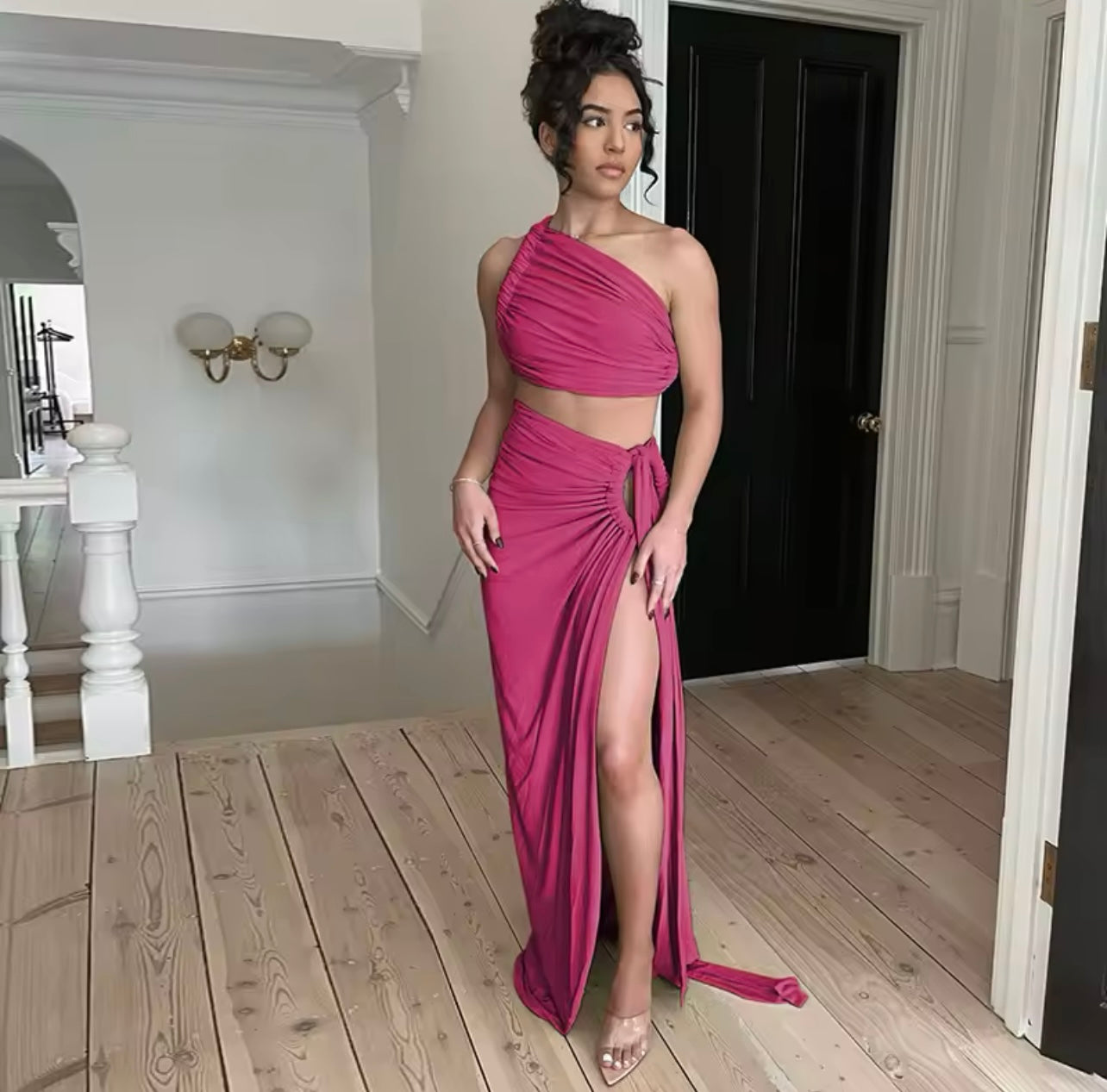 Das Set ist oben kurz, Asymmetrisch und unten lang mit Ausschnitten geschnitten. Es besteht aus Polyester und leichtem Stretch. Es ist ein echter Hingucker..