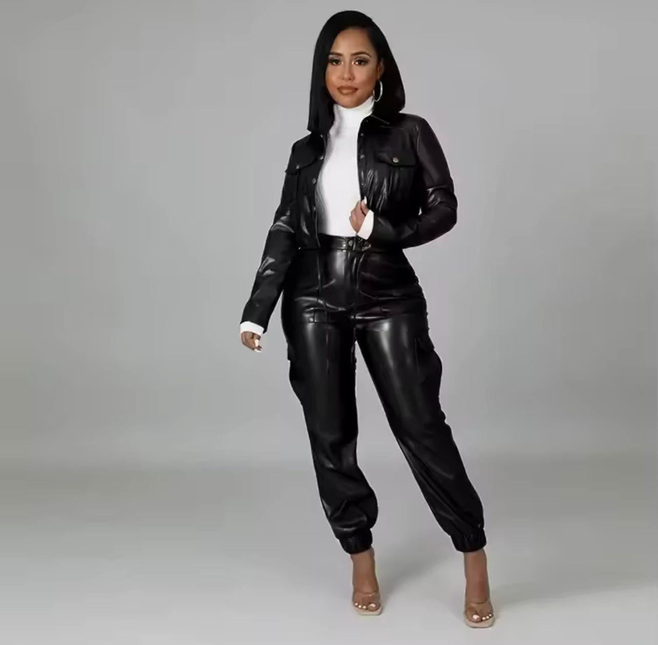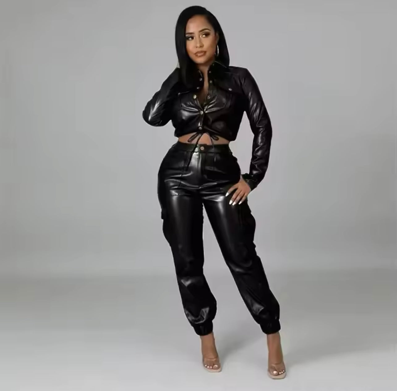Das Set ist oben kurz und unten lang geschnitten. Es besteht aus Kunstfaser, Polyester und leichtem Stretch..