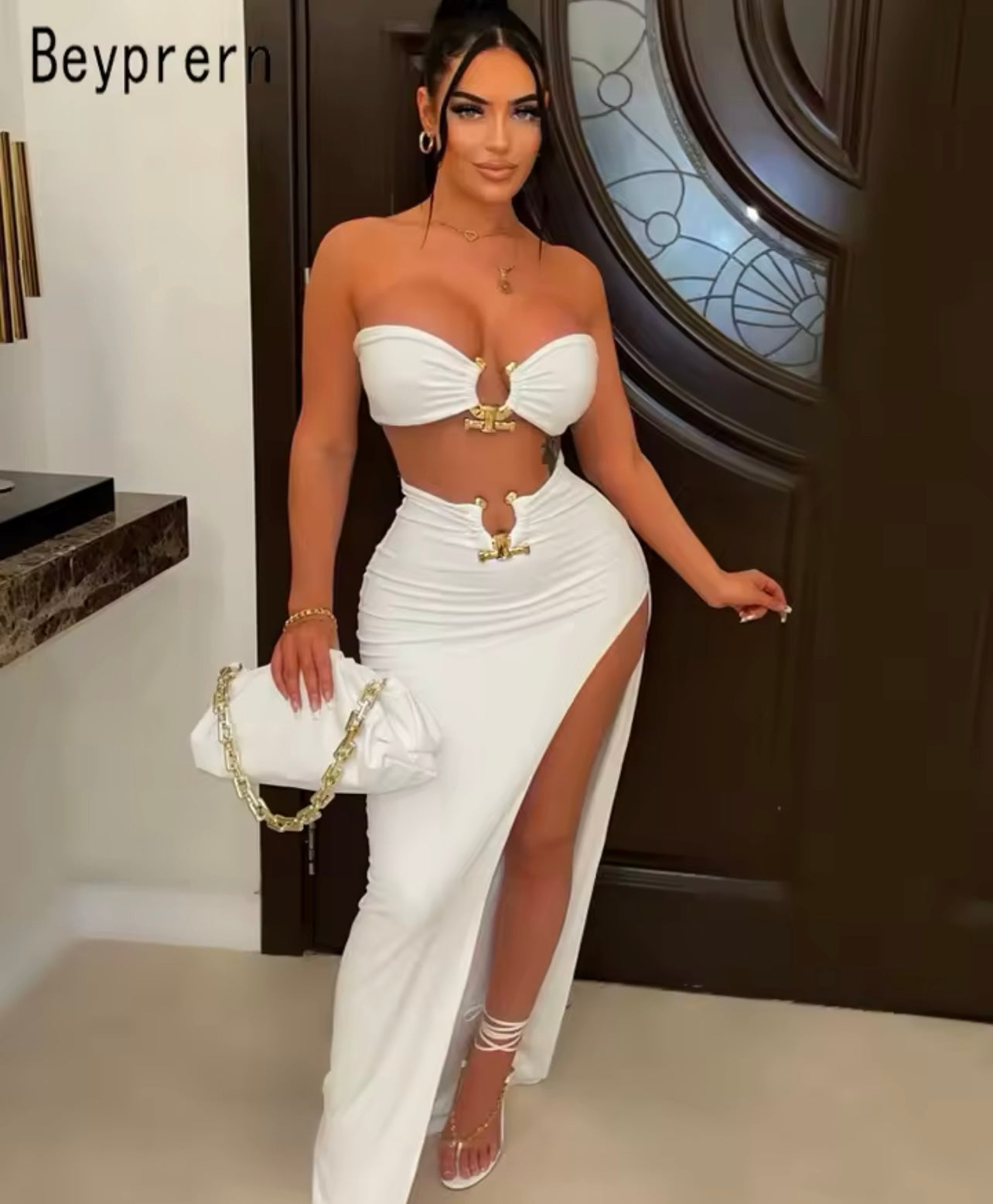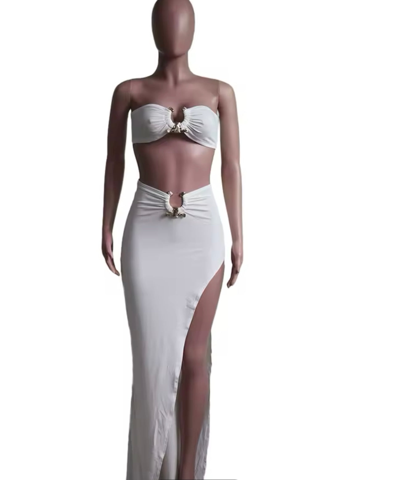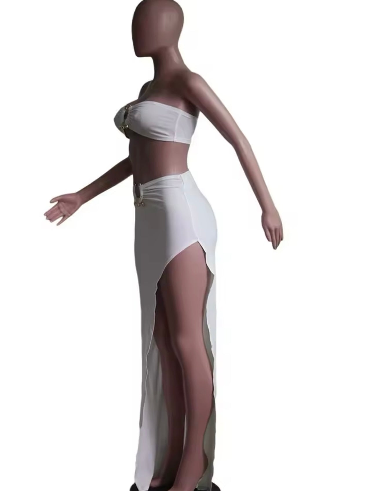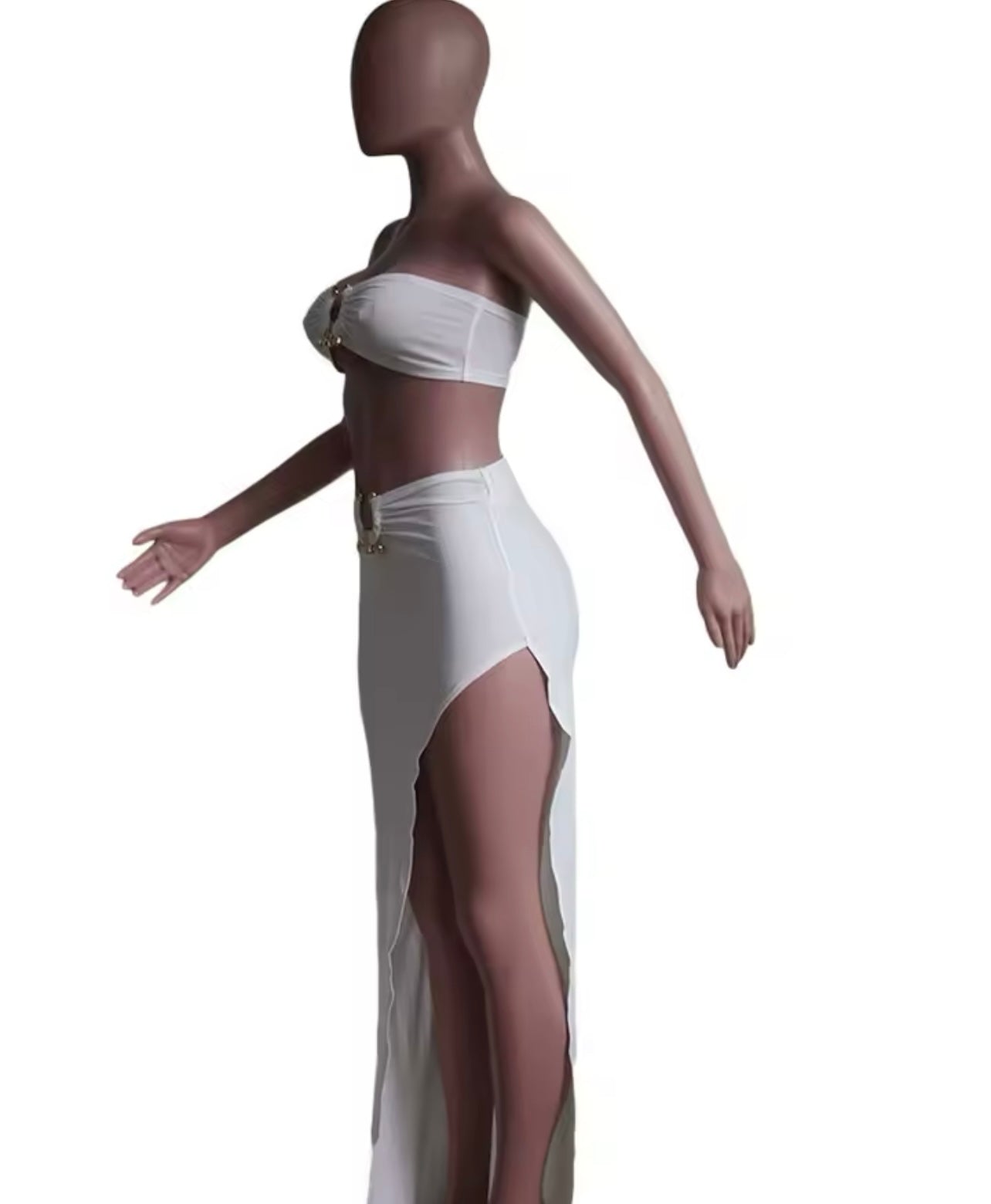 Das Set ist oben Kurz, unten Lang geschnitten und mit Applikationen verziert.. Es besteht aus Kunstfaser, Polyester und Elasthan. Das Set ist das perfekte Sommer Outfit..
