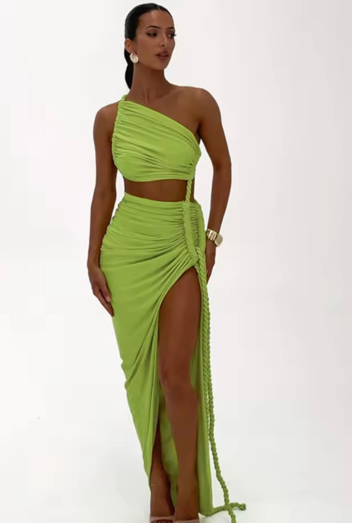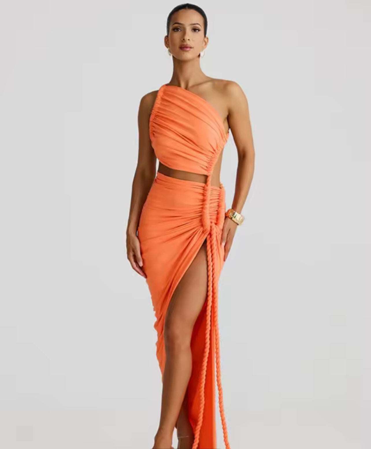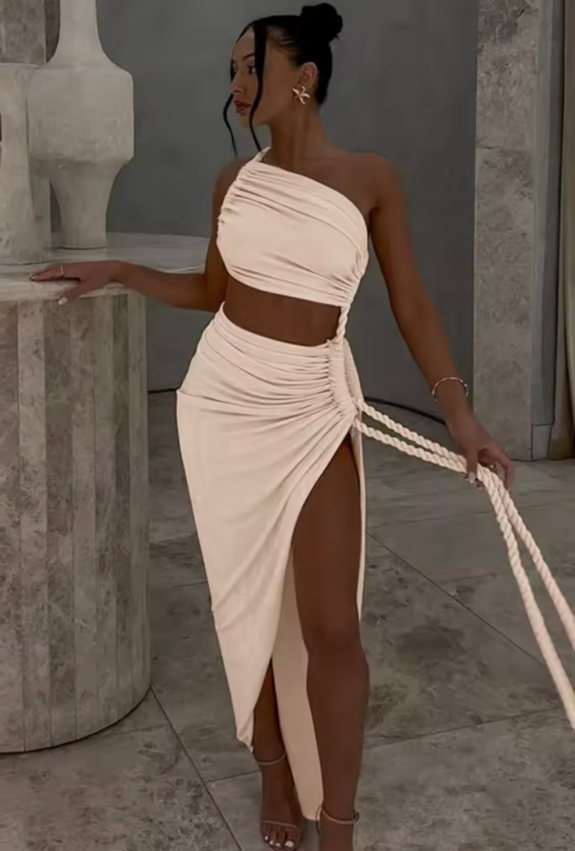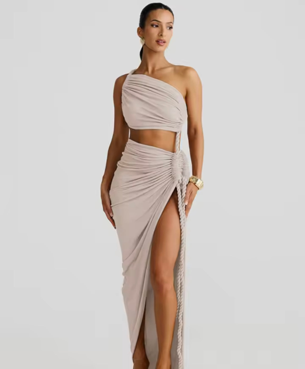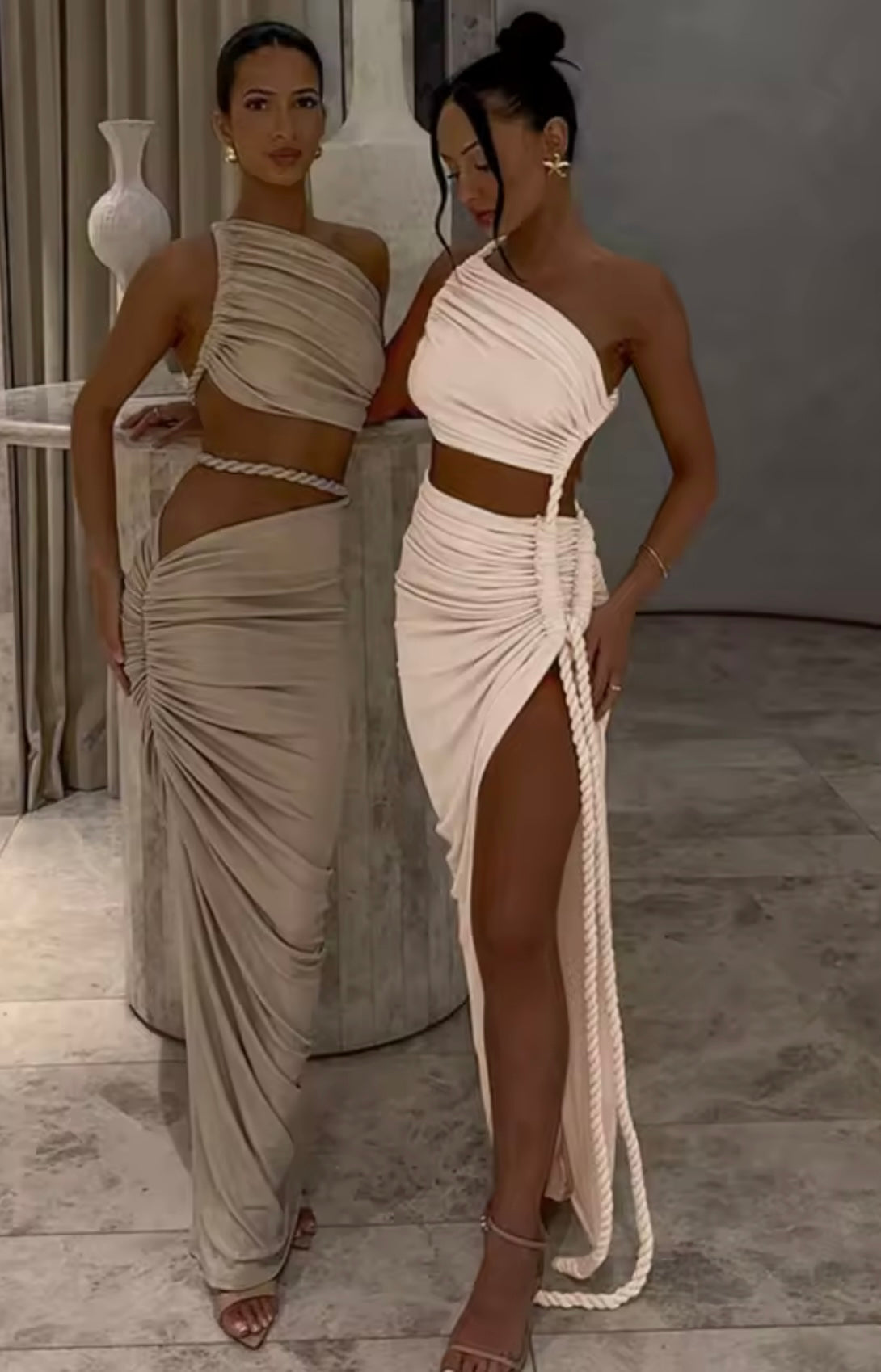 Das Set ist One Shoulder, Asymmetrisch, lang, mit hohem Schlitz geschnitten und mit Kordeln verziert. Es besteht aus Kunstfaser, Polyester, Elasthan und leichtem Stretch. Das Set ist ein absoluter Hingucker und der perfekte Sommerlook…