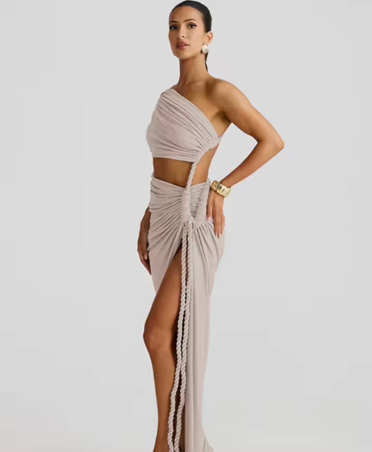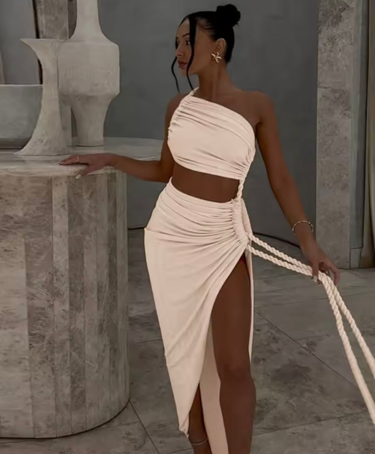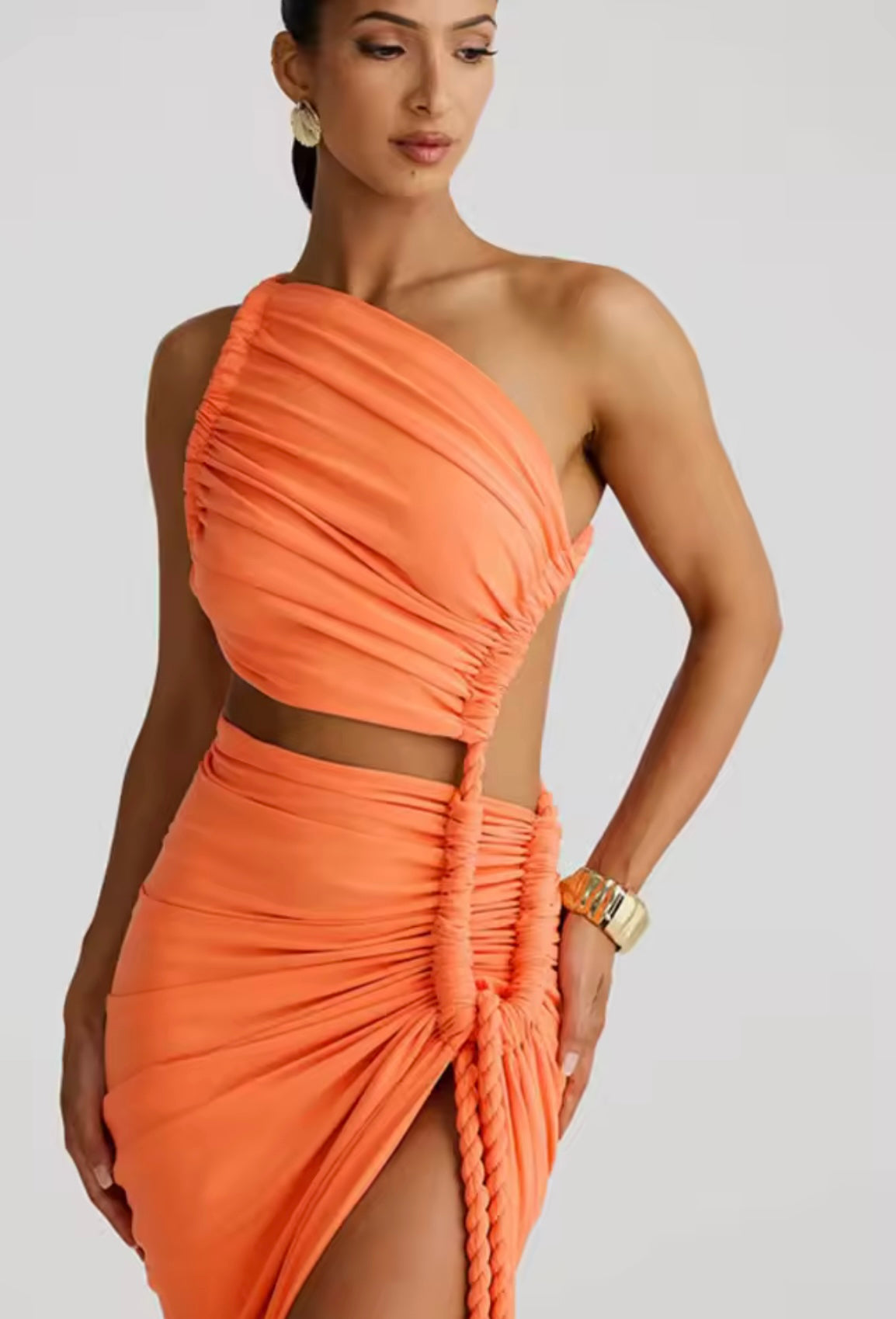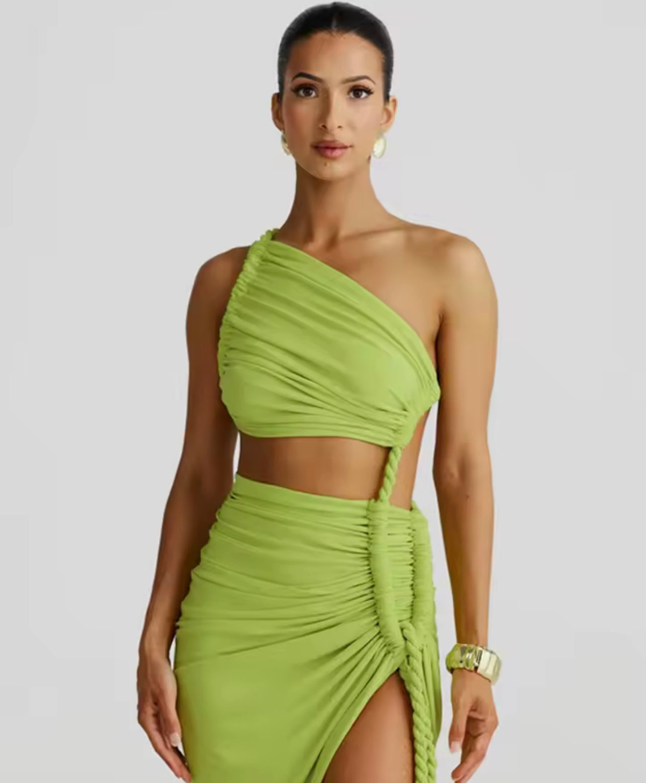 Das Set ist One Shoulder, Asymmetrisch, lang, mit hohem Schlitz geschnitten und mit Kordeln verziert. Es besteht aus Kunstfaser, Polyester, Elasthan und leichtem Stretch. Das Set ist ein absoluter Hingucker und der perfekte Sommerlook…
