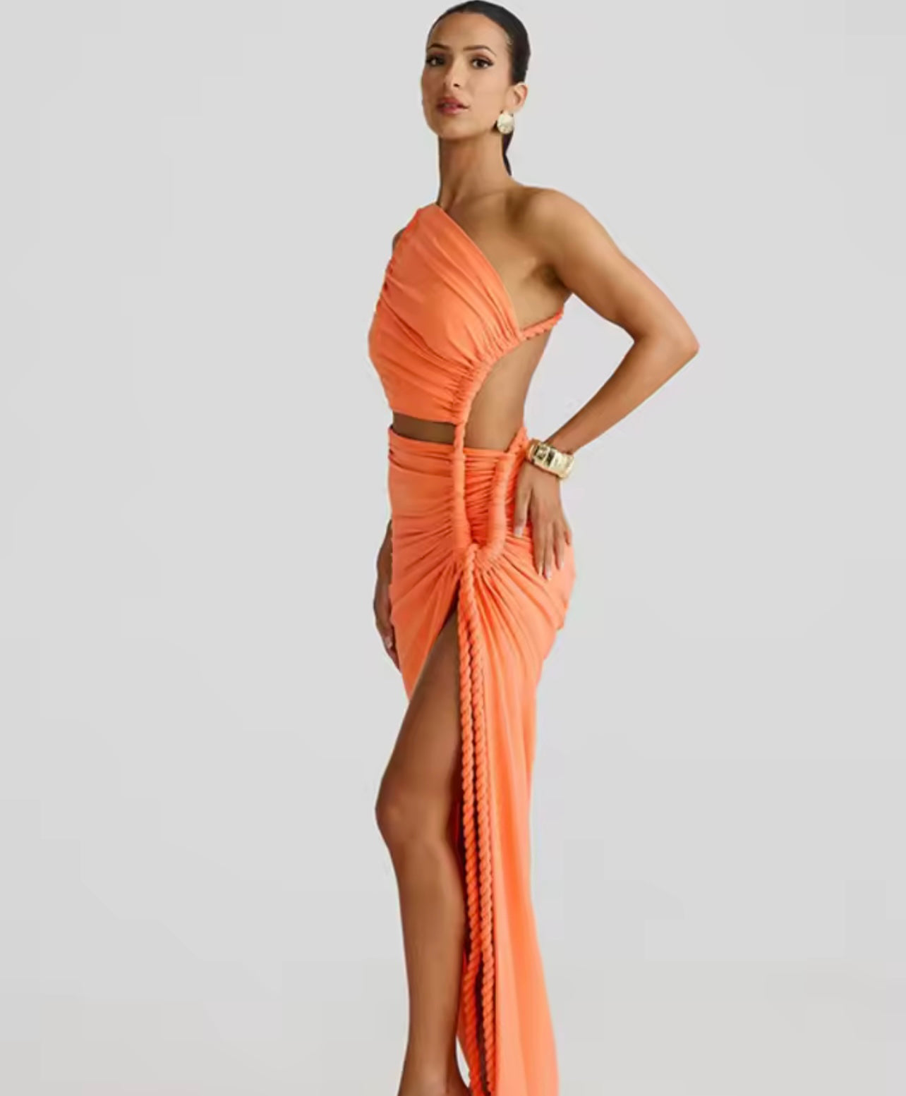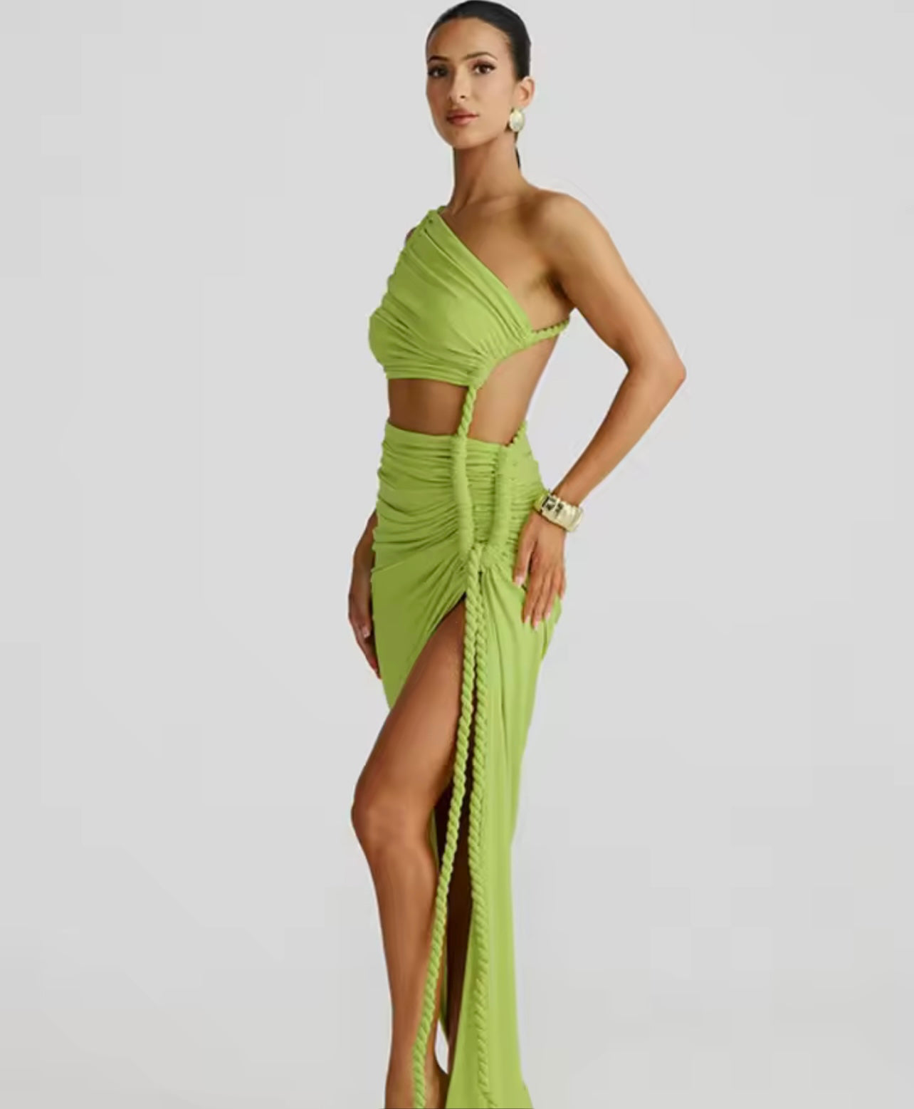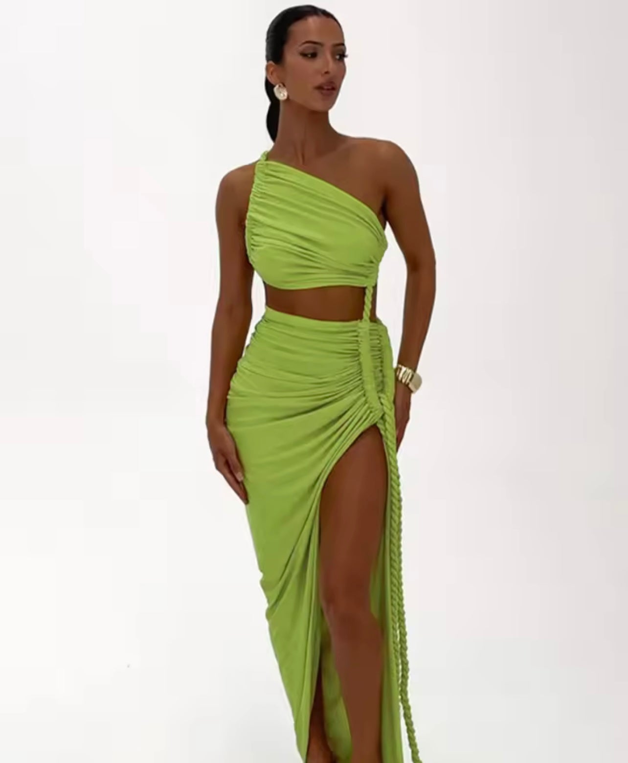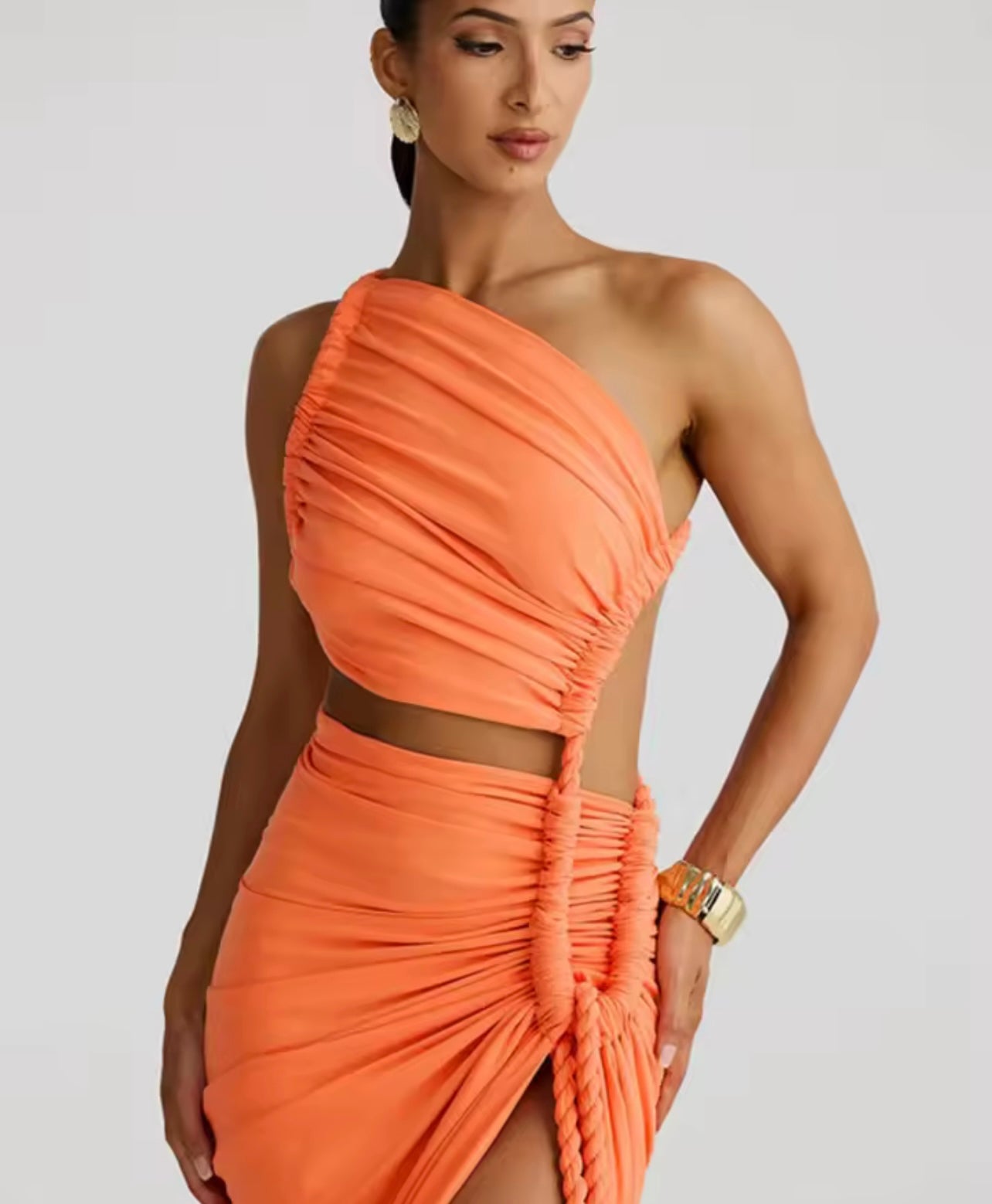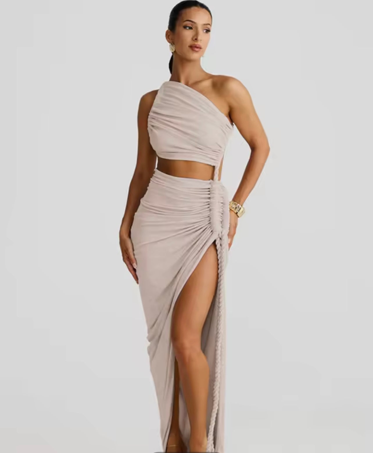 Das Set ist One Shoulder, Asymmetrisch, lang, mit hohem Schlitz geschnitten und mit Kordeln verziert. Es besteht aus Kunstfaser, Polyester, Elasthan und leichtem Stretch. Das Set ist ein absoluter Hingucker und der perfekte Sommerlook…