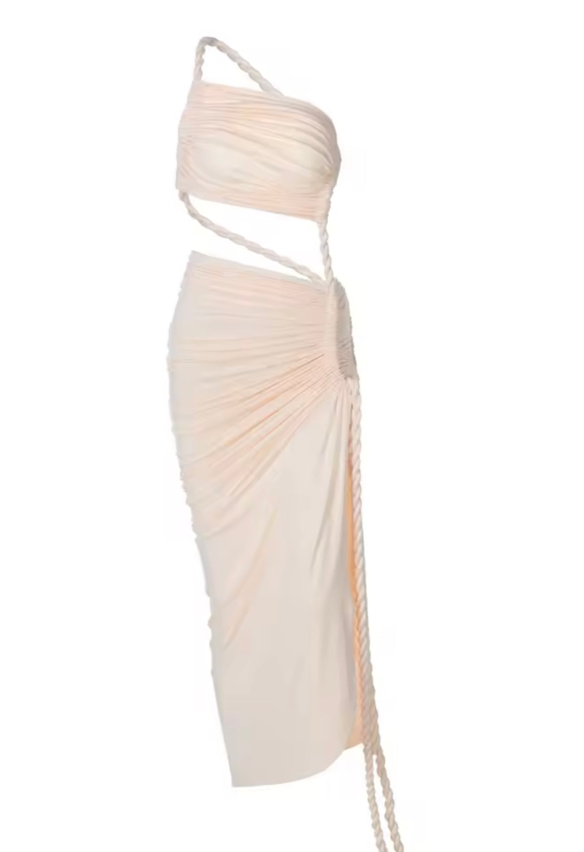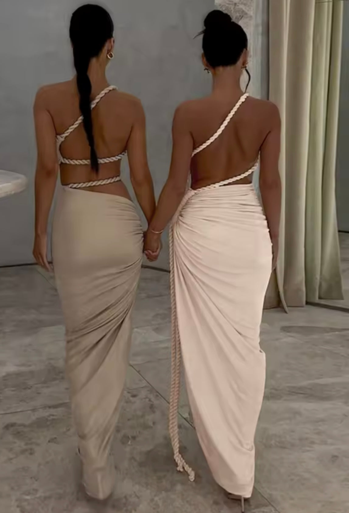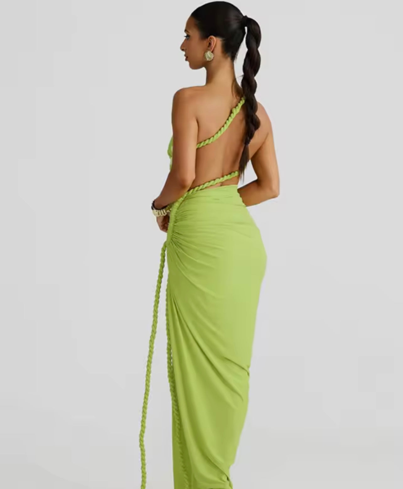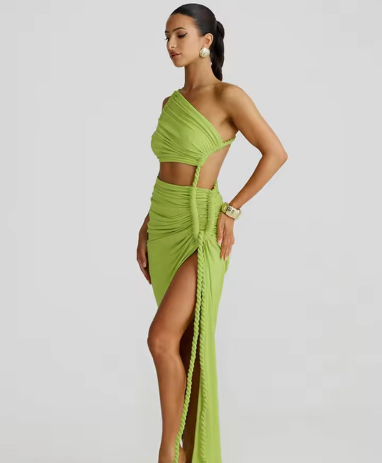 Das Set ist One Shoulder, Asymmetrisch, lang, mit hohem Schlitz geschnitten und mit Kordeln verziert. Es besteht aus Kunstfaser, Polyester, Elasthan und leichtem Stretch. Das Set ist ein absoluter Hingucker und der perfekte Sommerlook…
