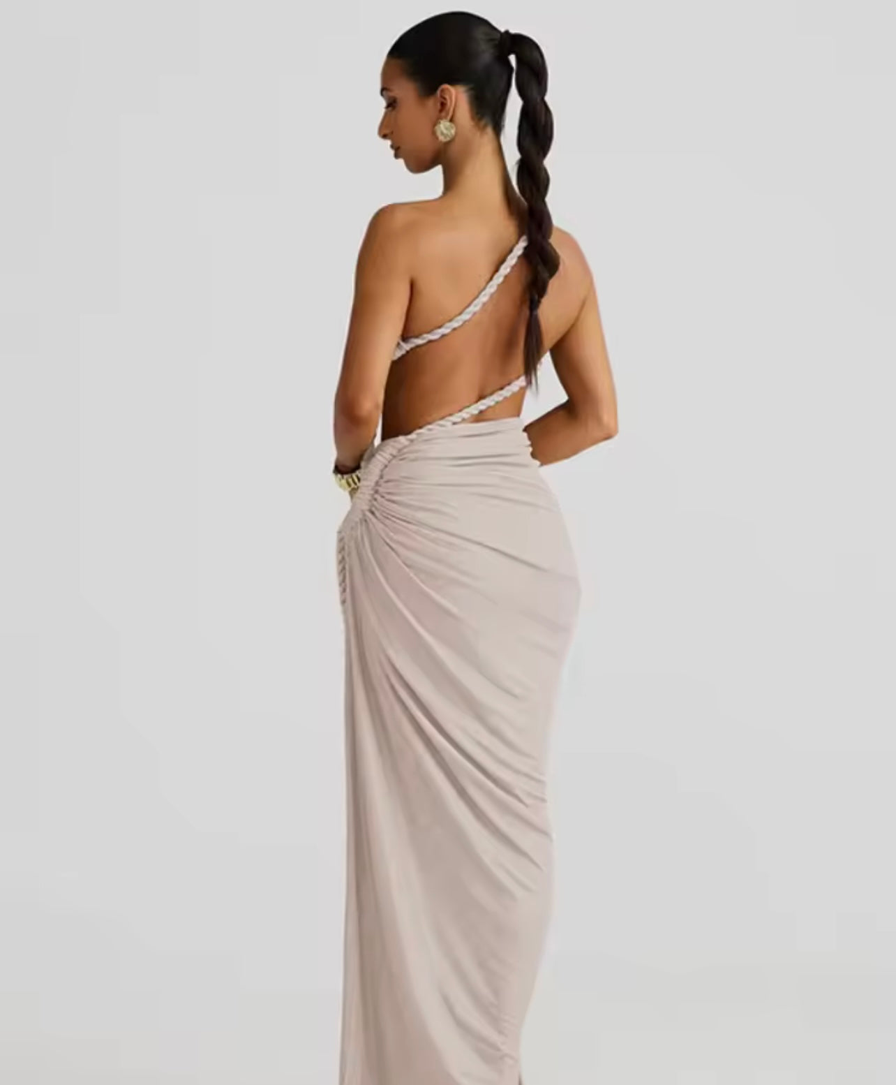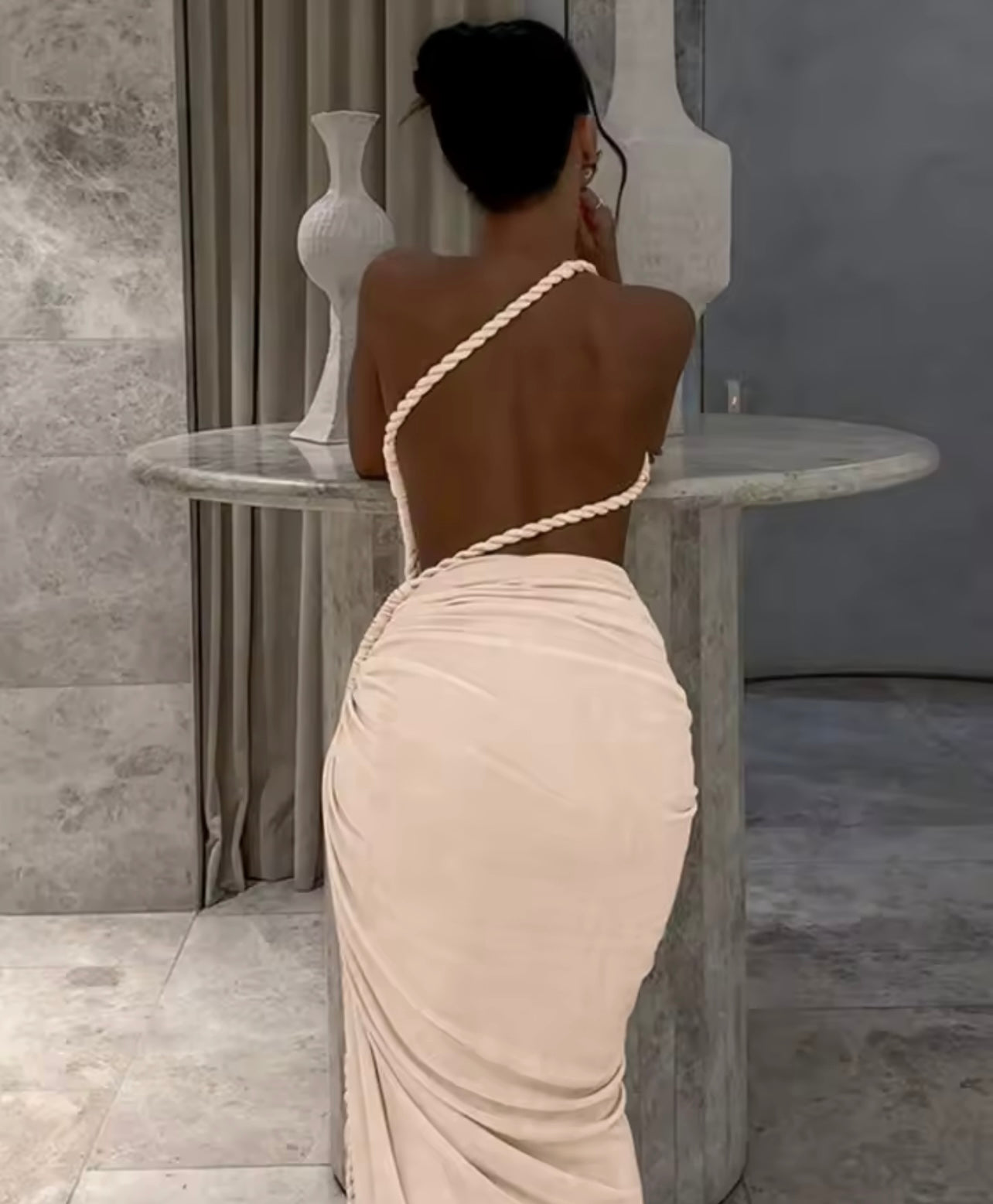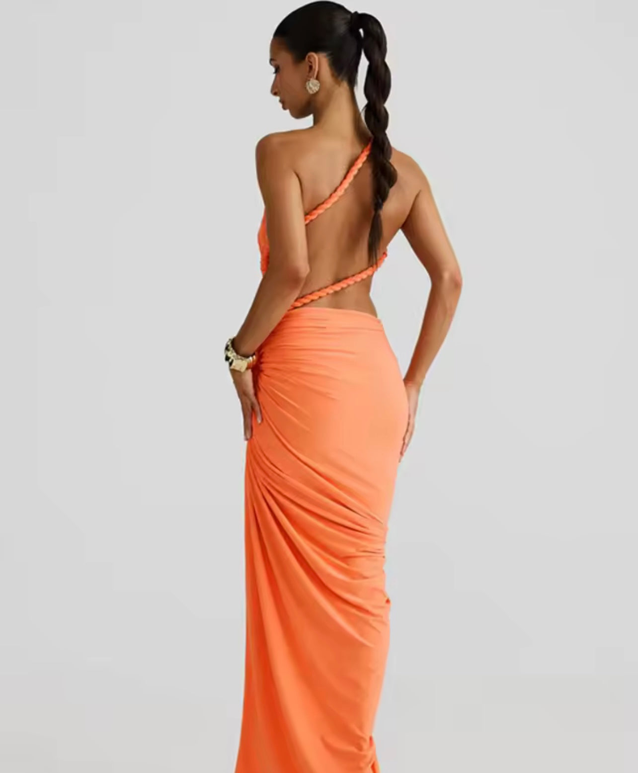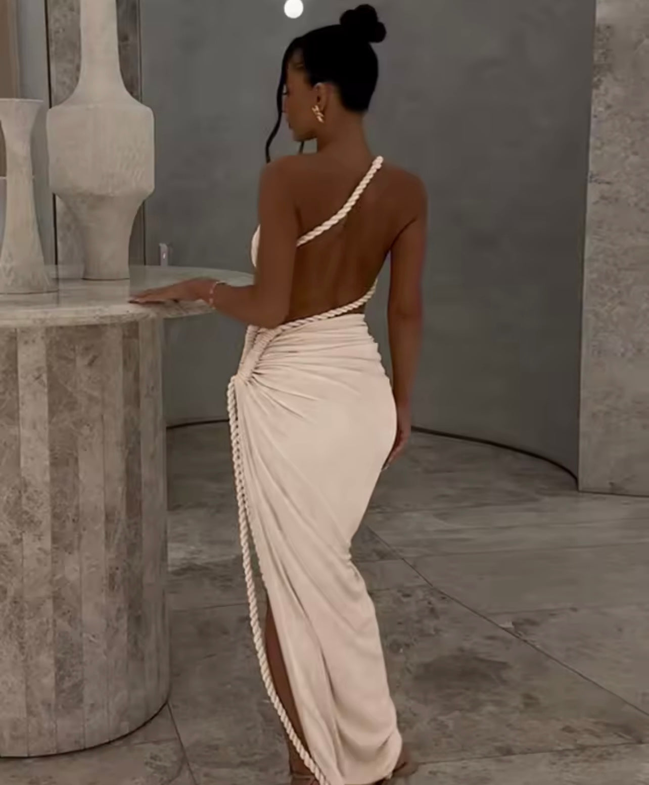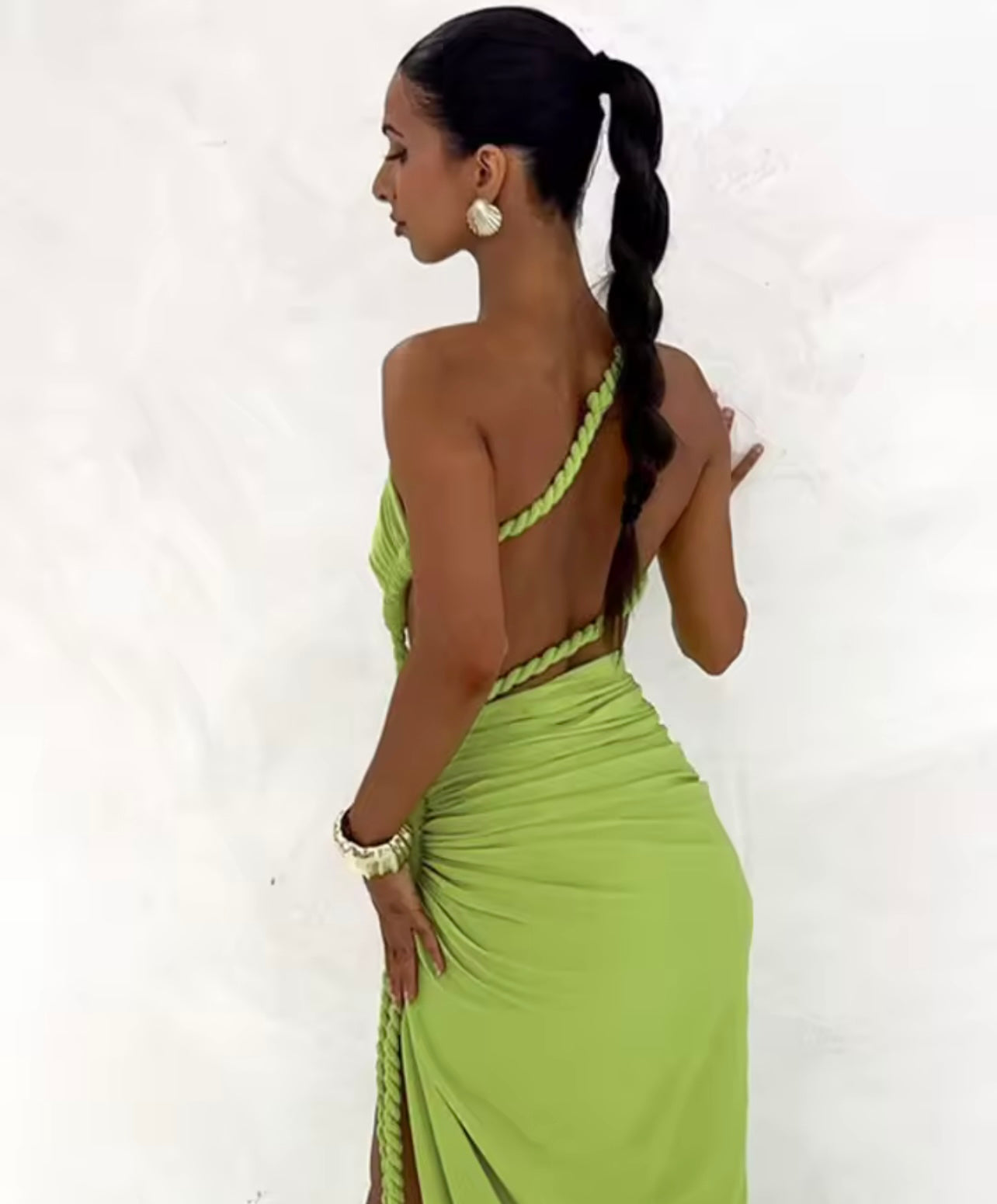 Das Set ist One Shoulder, Asymmetrisch, lang, mit hohem Schlitz geschnitten und mit Kordeln verziert. Es besteht aus Kunstfaser, Polyester, Elasthan und leichtem Stretch. Das Set ist ein absoluter Hingucker und der perfekte Sommerlook…