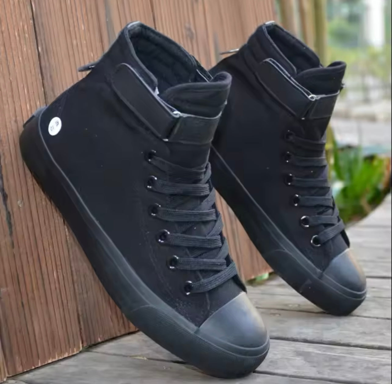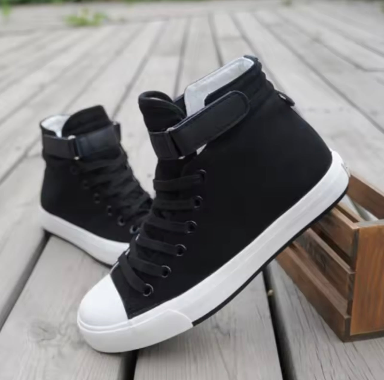 Die Sneaker sind Knöchelhoch geschnitten und mit einer schnalle verziert. Sie bestehen aus Leinen..