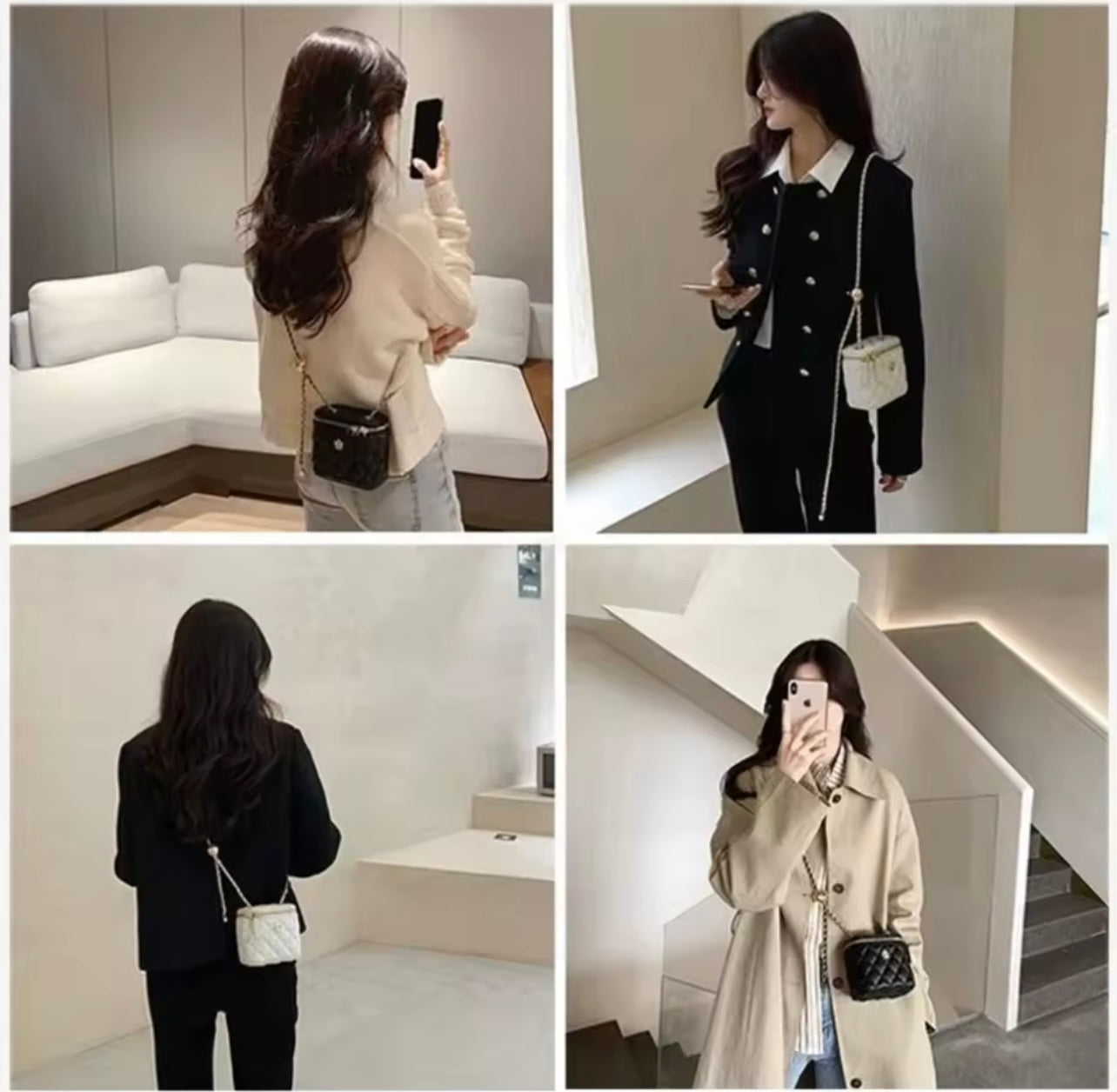 Die Tasche ist klein geschnitten, mit Applikationen und Umhängeketten verziert. Sie besteht aus Kunstleder und Polyester. Die Tasche ist ein echter Hingucker..