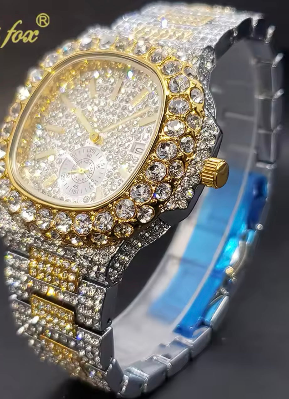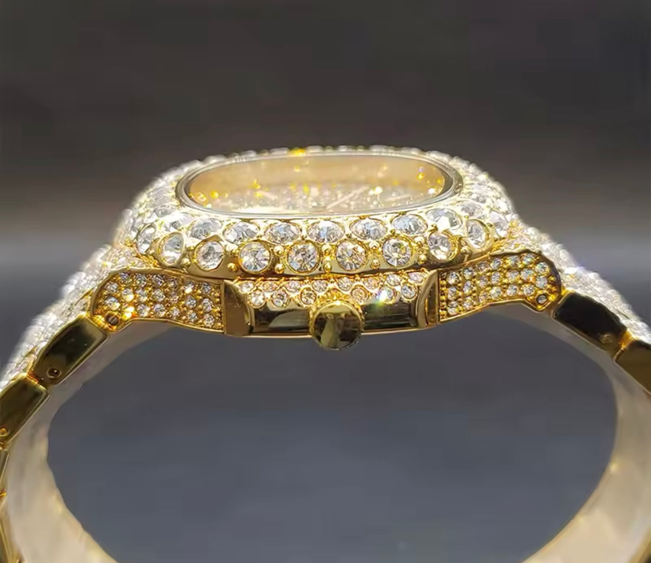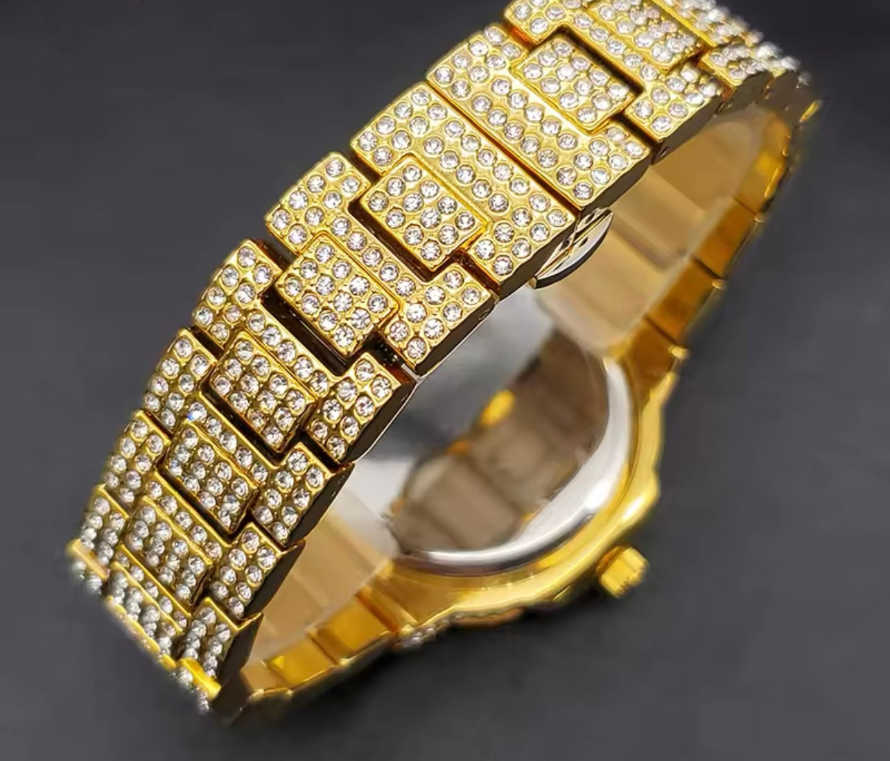 Die Uhr ist komplett mit Strass verziert und funkelt extrem im Licht. Sie besteht aus Strasssteinchen und Edelstahl..