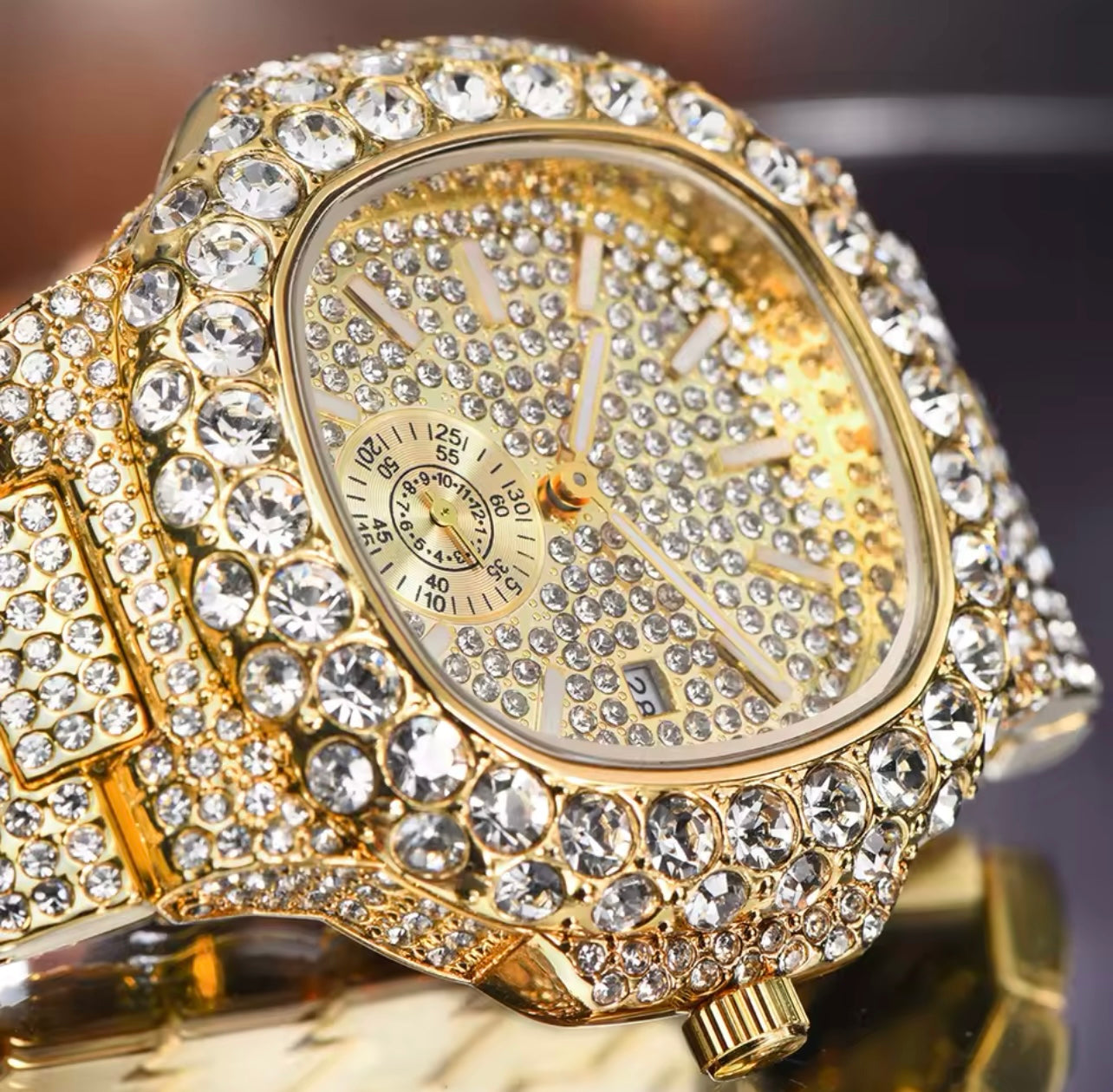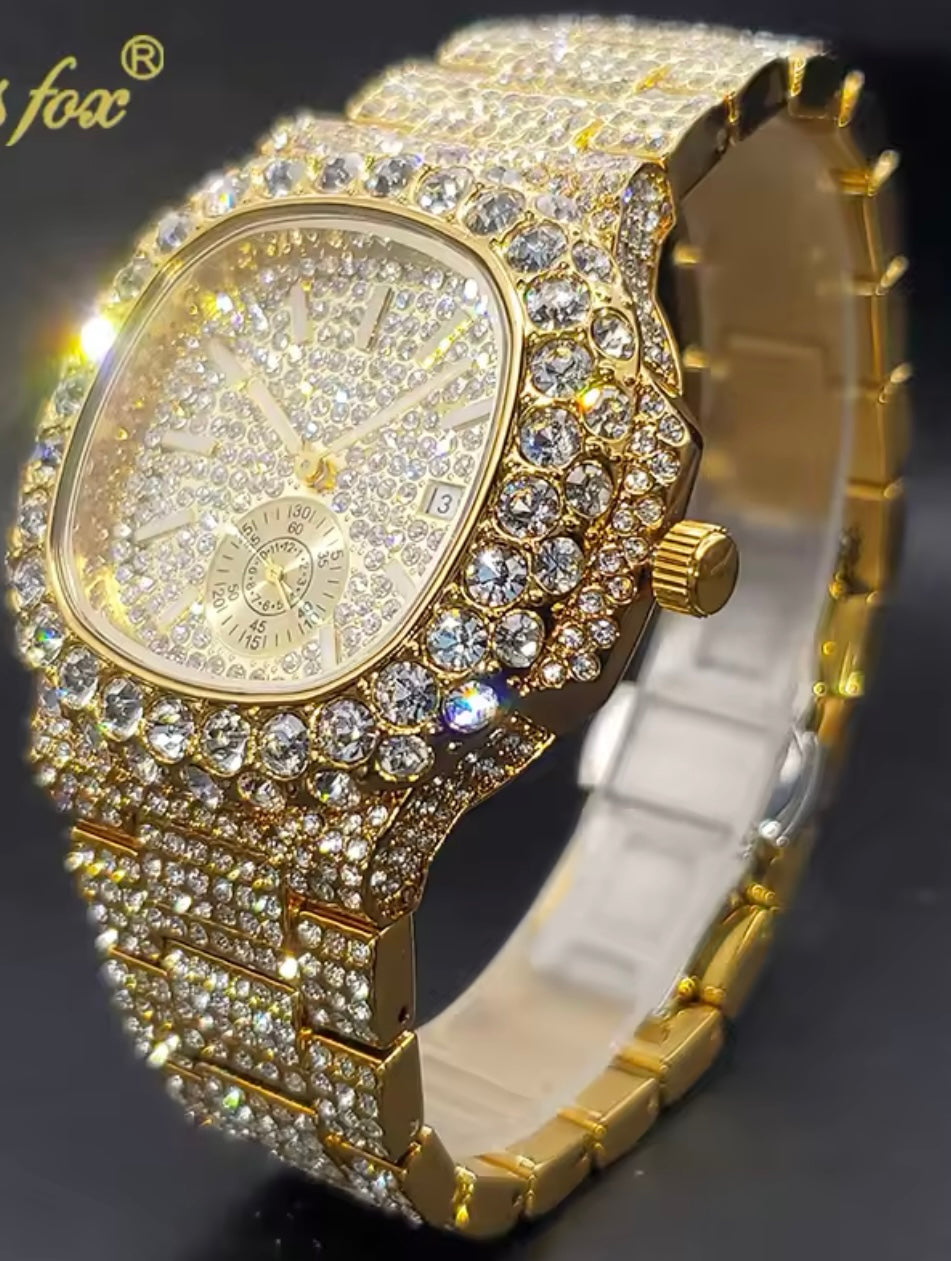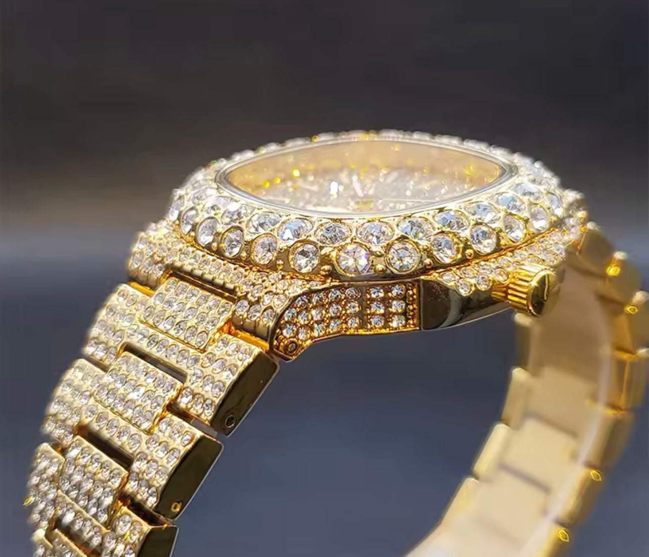 Die Uhr ist komplett mit Strass verziert und funkelt extrem im Licht. Sie besteht aus Strasssteinchen und Edelstahl..