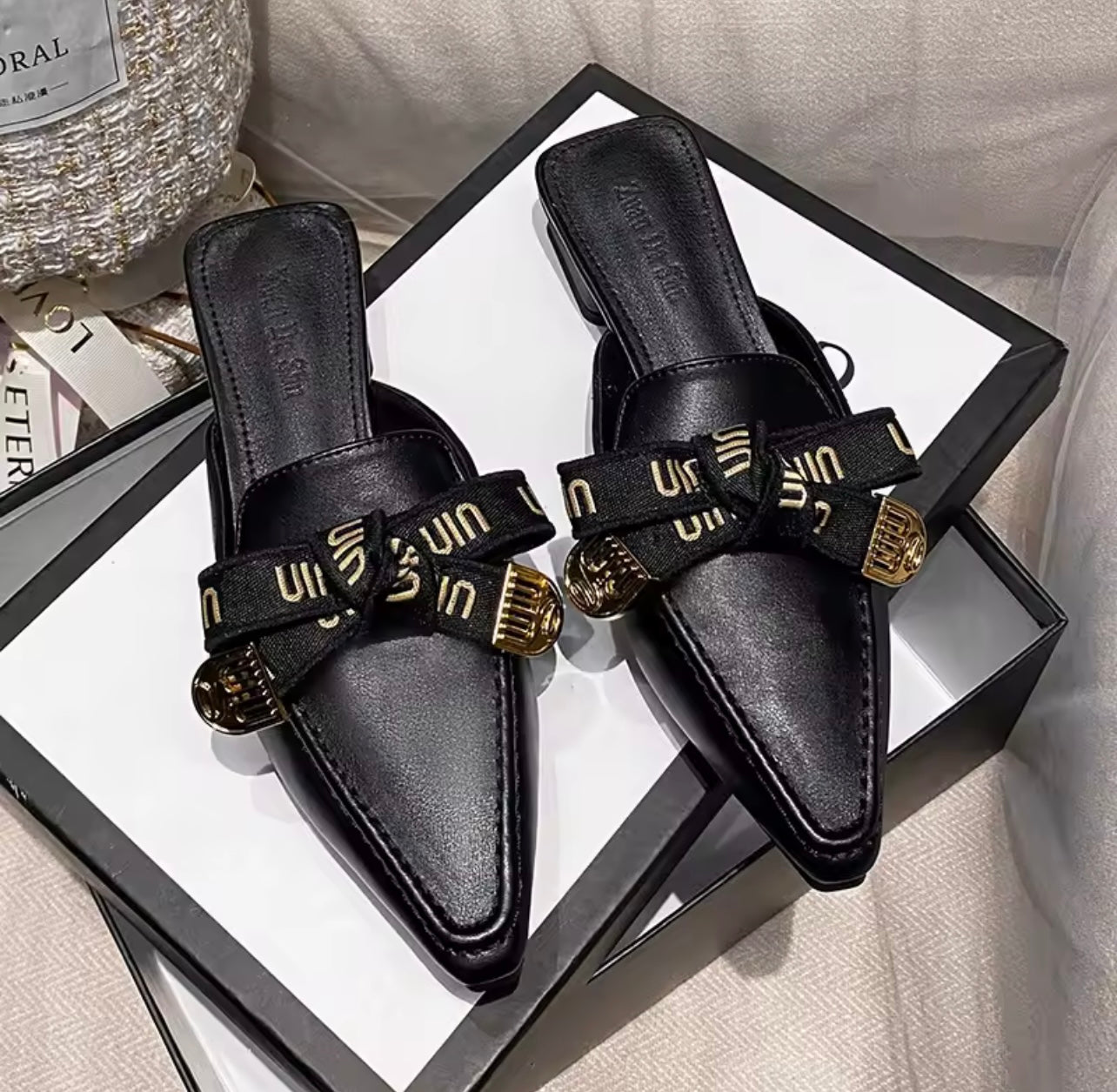 Die Slipper sind vorne geschlossen, Spitz geschnitten und mit Applikationen verziert. Sie bestehen aus Mikrofaser Leder und Polyester. Die Slipper sehen sehr stylisch aus und passnen zu jedem eleganten Look..