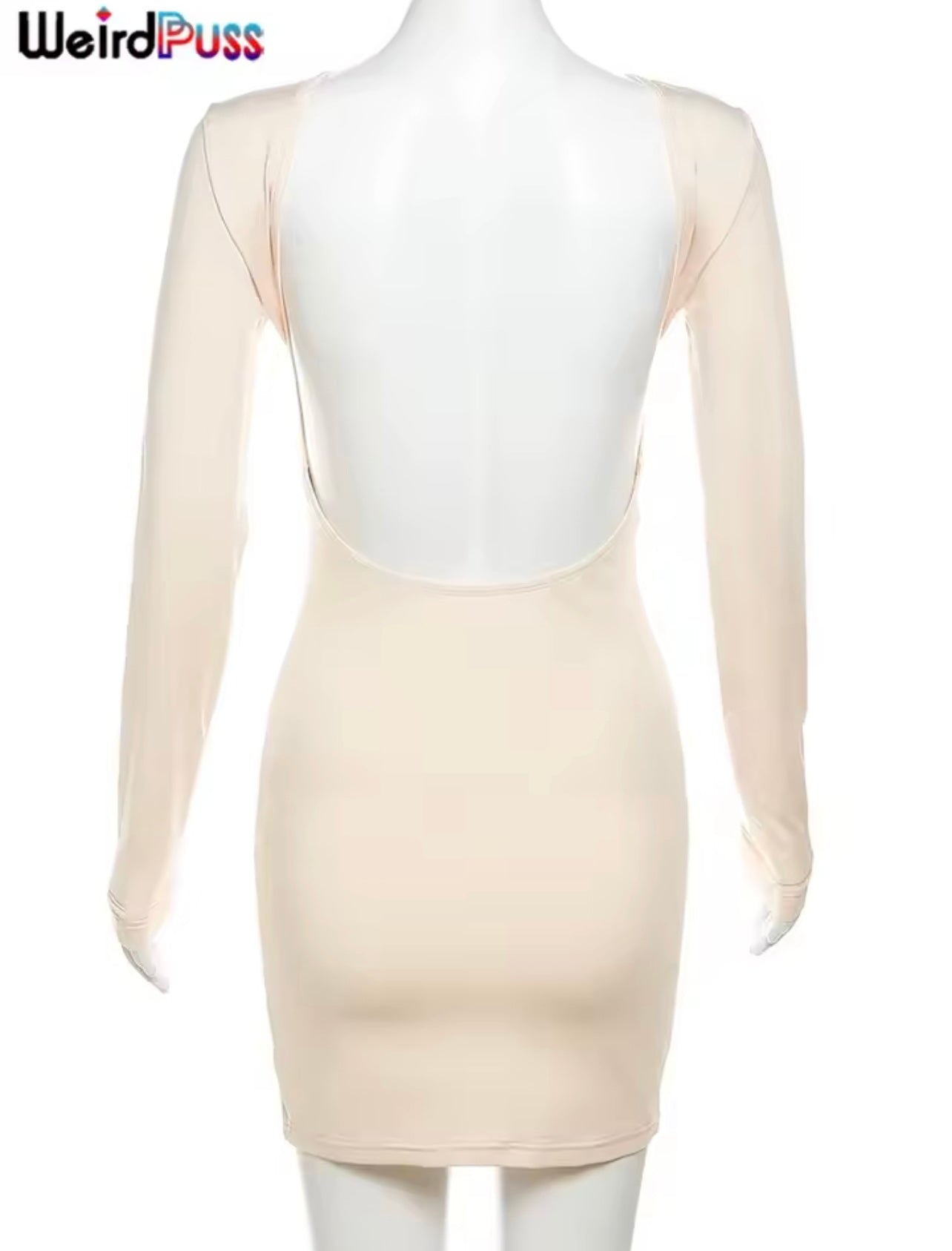 Das Kleid ist kurz, eng, langärmlig und Rückenfrei geschnitten. Es besteht aus Kunstfaser, Elasthan und Polyester. Das Kleid passt perfekt zu jedem sexy Look..