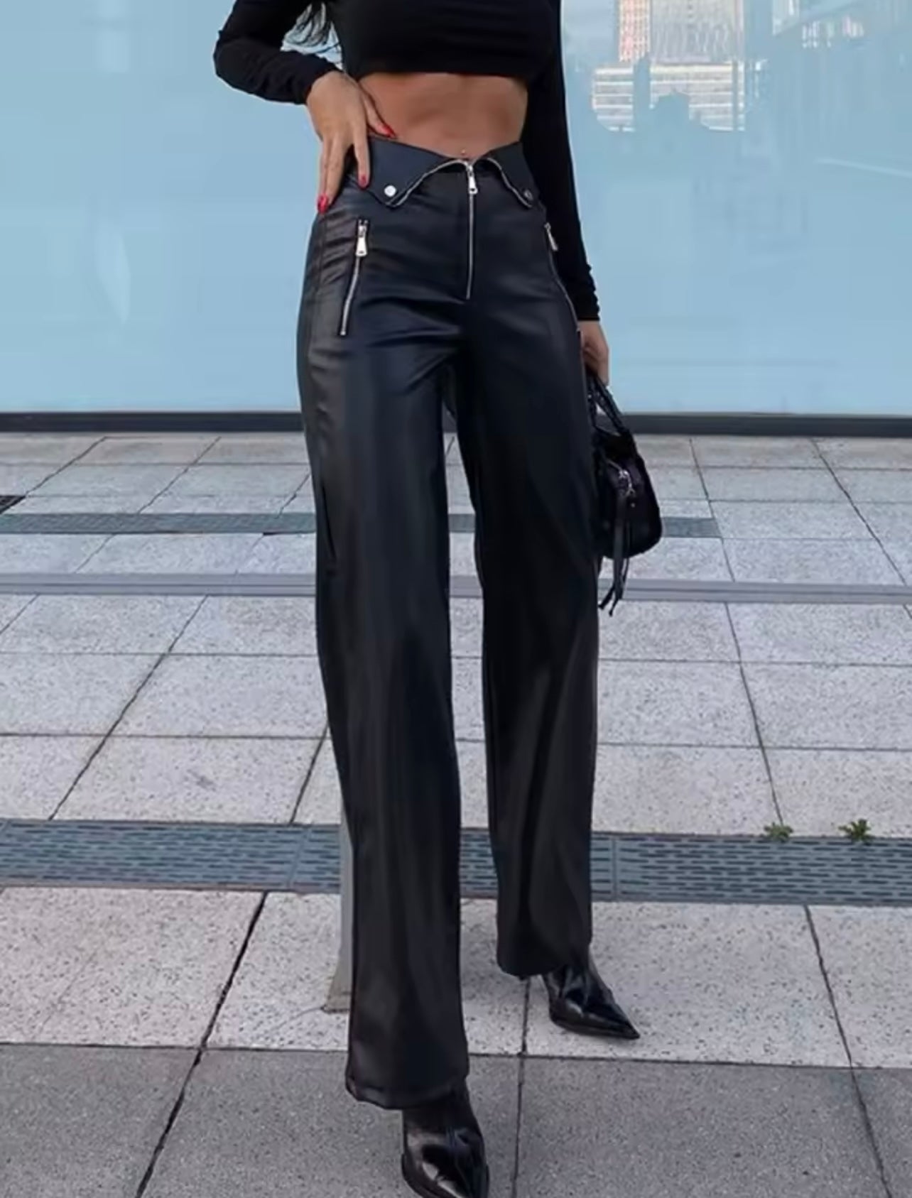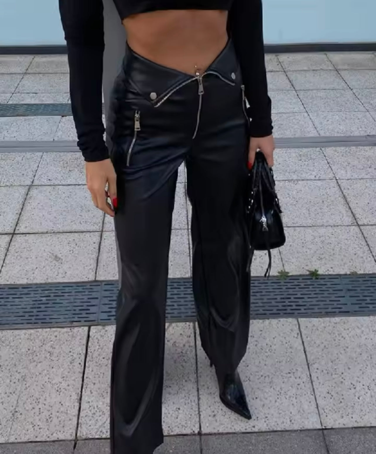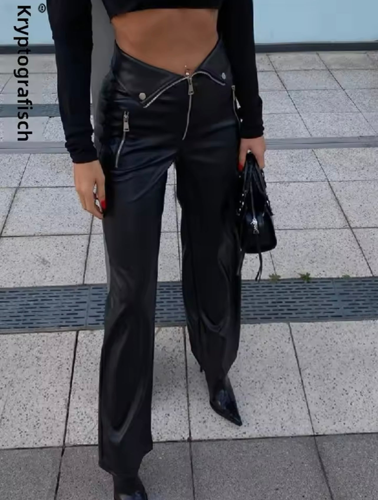 Die Hose ist gerade geschnitten und mit Reißverschlüssen/Knöpfen verziert. Sie besteht aus Kunstleder, Elasthan, Polyester und leichtem Stretch. Sie passt perfekt zu jedem Style..